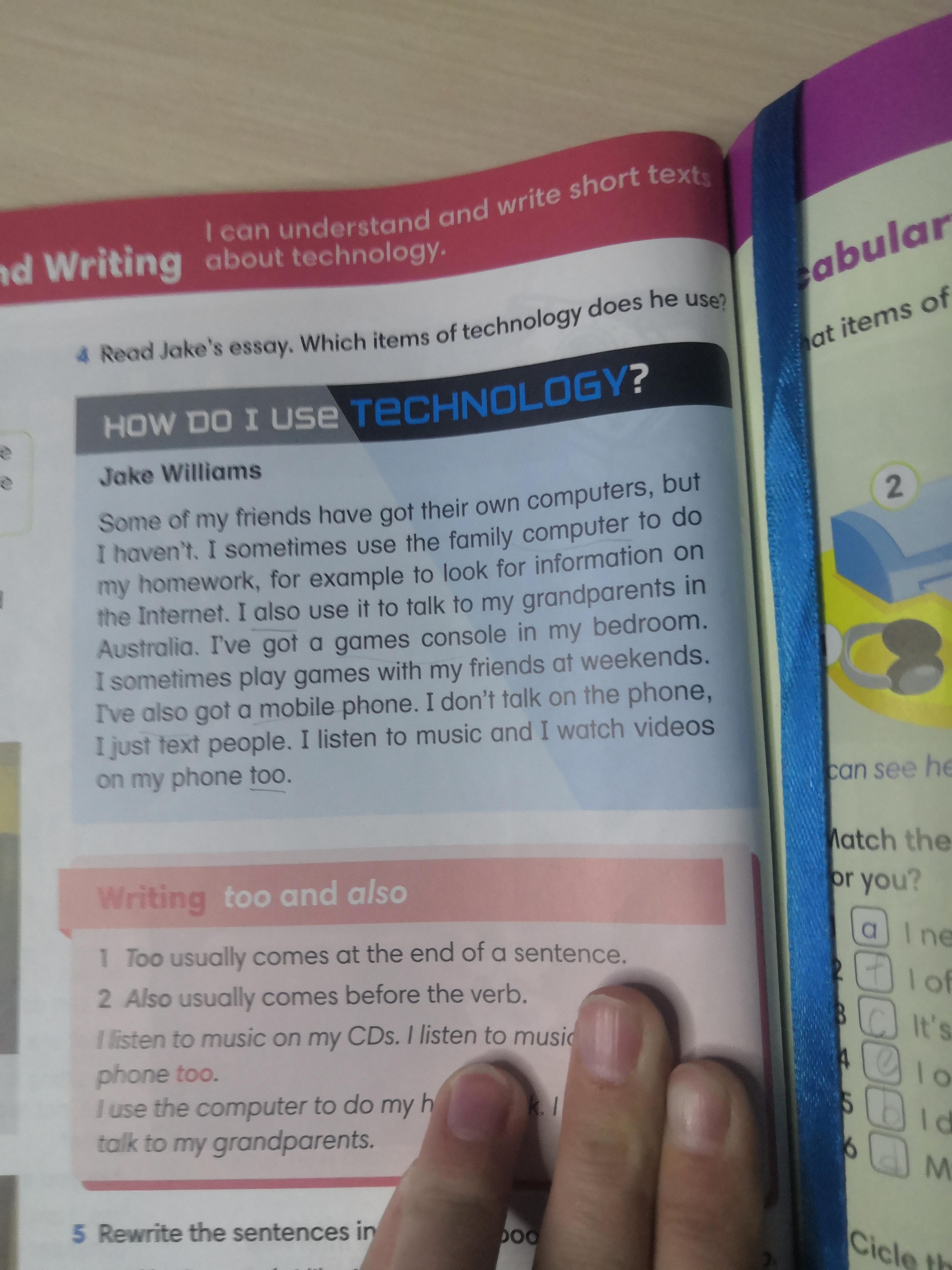 У некоторых моих друзей есть свои собственные компьютеры, но у меня его нет, я иногда использую семейный компьютер для выполнения домашней работы, например, для поиска информации в Интернете. Я также использую его, чтобы поговорить со своими бабушкой и дедушкой в Австралии. У меня в спальне есть игровая приставка. Я иногда играю в игры со своими друзьями по выходным. А еще у меня есть мобильный телефон. Я не разговариваю по телефону, я просто переписываюсь с людьми. Я тоже слушаю музыку и смотрю видео на своем телефоне.