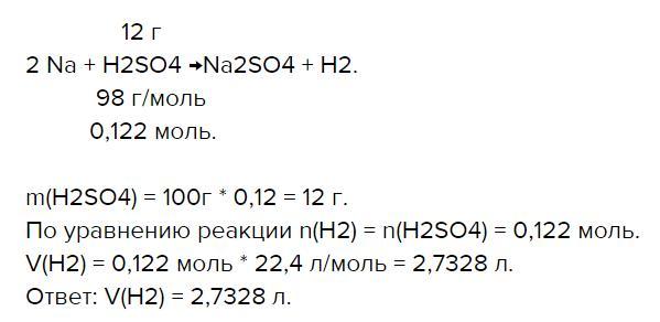 Сколько литров водорода образуется при взаимодействии 100 г раствора серной кислоты с массовой долей 12% с натрием?