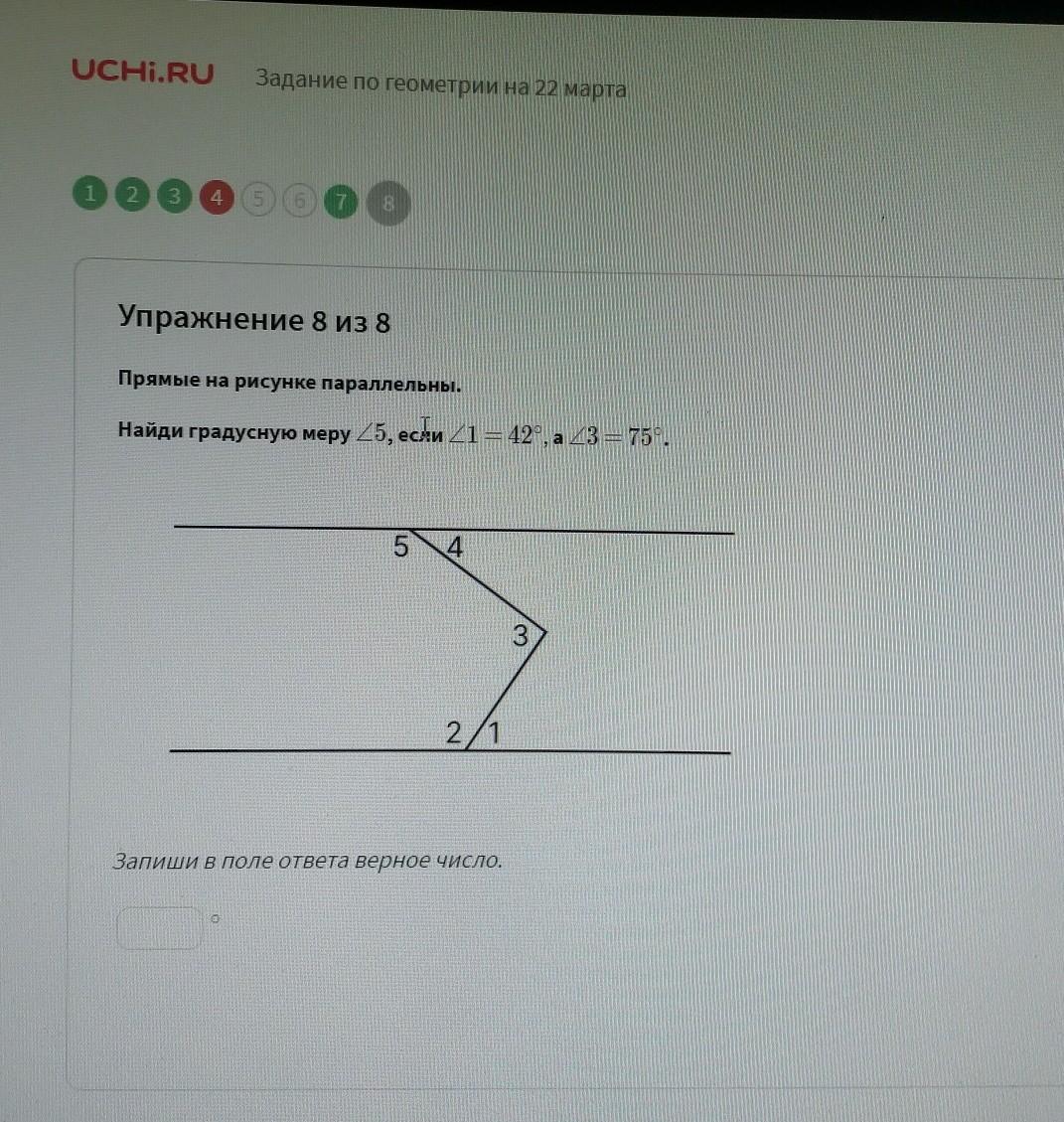 Назовем угол пересечения нижней параллели и прямой шестым. Угол шесть равен 33 градусам (по сумме углов треугольника). Угол шесть является накрест лежащим с углом 4. А угол 5 равен 180 - 33 = 147