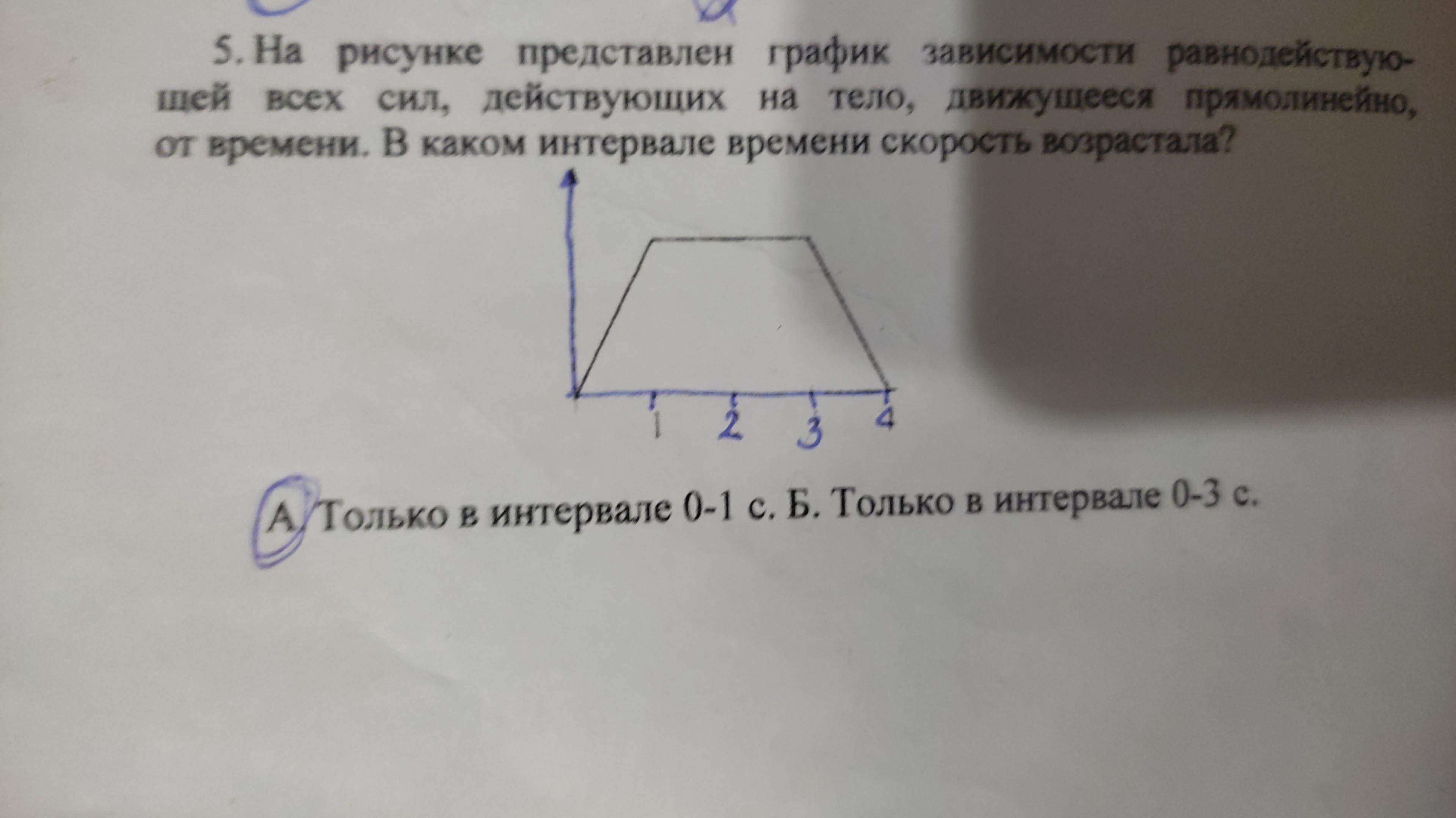 На рисунке представлен график зависимости равнодействующей всех сил, действующих на тело,движущееся прямолинейно, от времени.В каком интервале времени скорость возрастала?A. 0-1.Б.0-3.В.0-4.Г.0-5