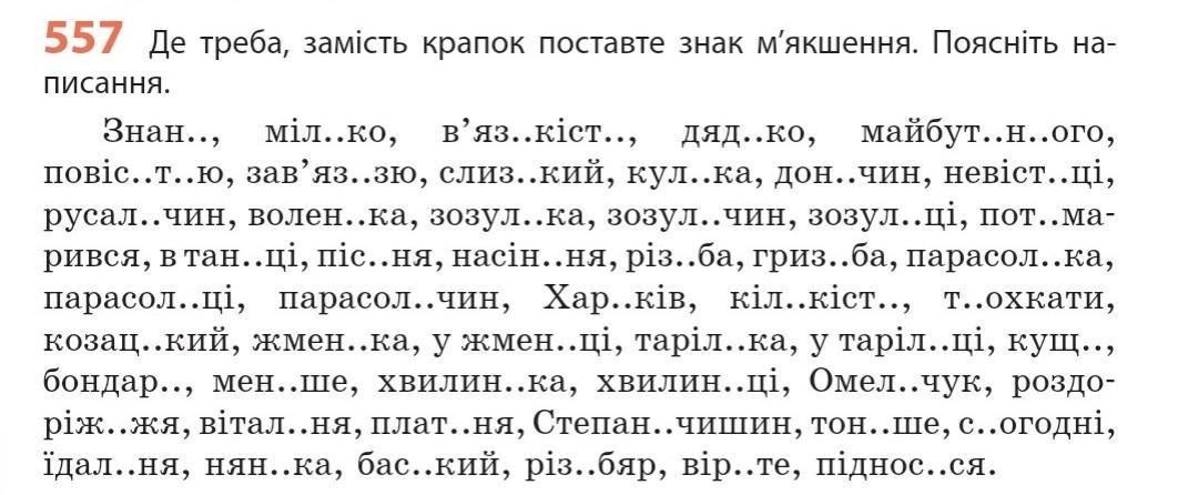 Знань, мілко, в'язкістю, дядько, майбутнього, повістю, зав'яззю, слизький, кулька, доньчин, невістці, русалчин, воленька, зозулька, зозульчин, зозульці, потьмарився, в танці, пісня, насіння, різьба, гризьба, парасолька, парасольці, парасольчин, Харків, кількість, тьохкати, козацький, жменька, у жменьці, тарілка, у тарілці, кущ, бондар, менше, хвилинка, хвилинці, Омельчук, роздоріжжя, вітальня, платня, Степанчишин, тонше, сьогодні, їдальня, нянька, баский, різьбяр, вірте, підносься.