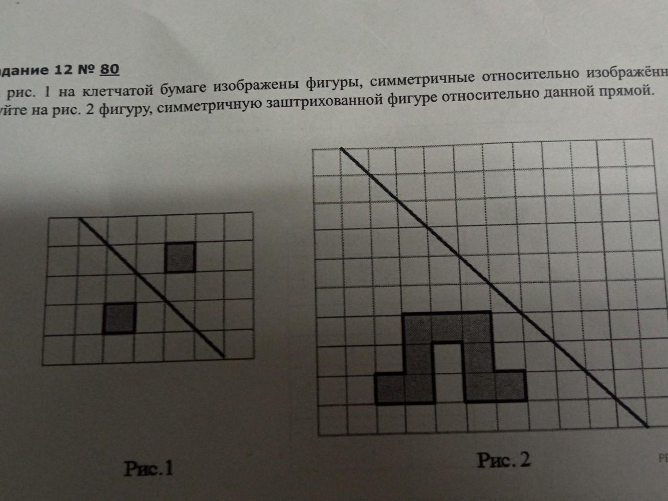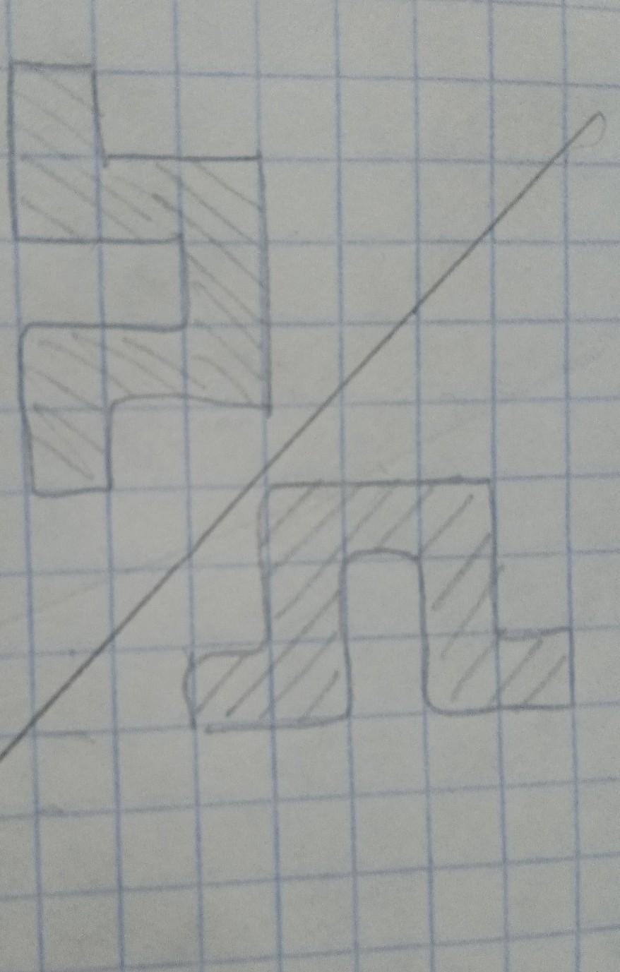 на рисунке 1 на клетчатой бумаге изображены фигуры, симметричные относительно изображённой прямой. Нарисуйте на рисунке 2 фигуру симметричную заштрихованной фигуре относительно данной прямой.
