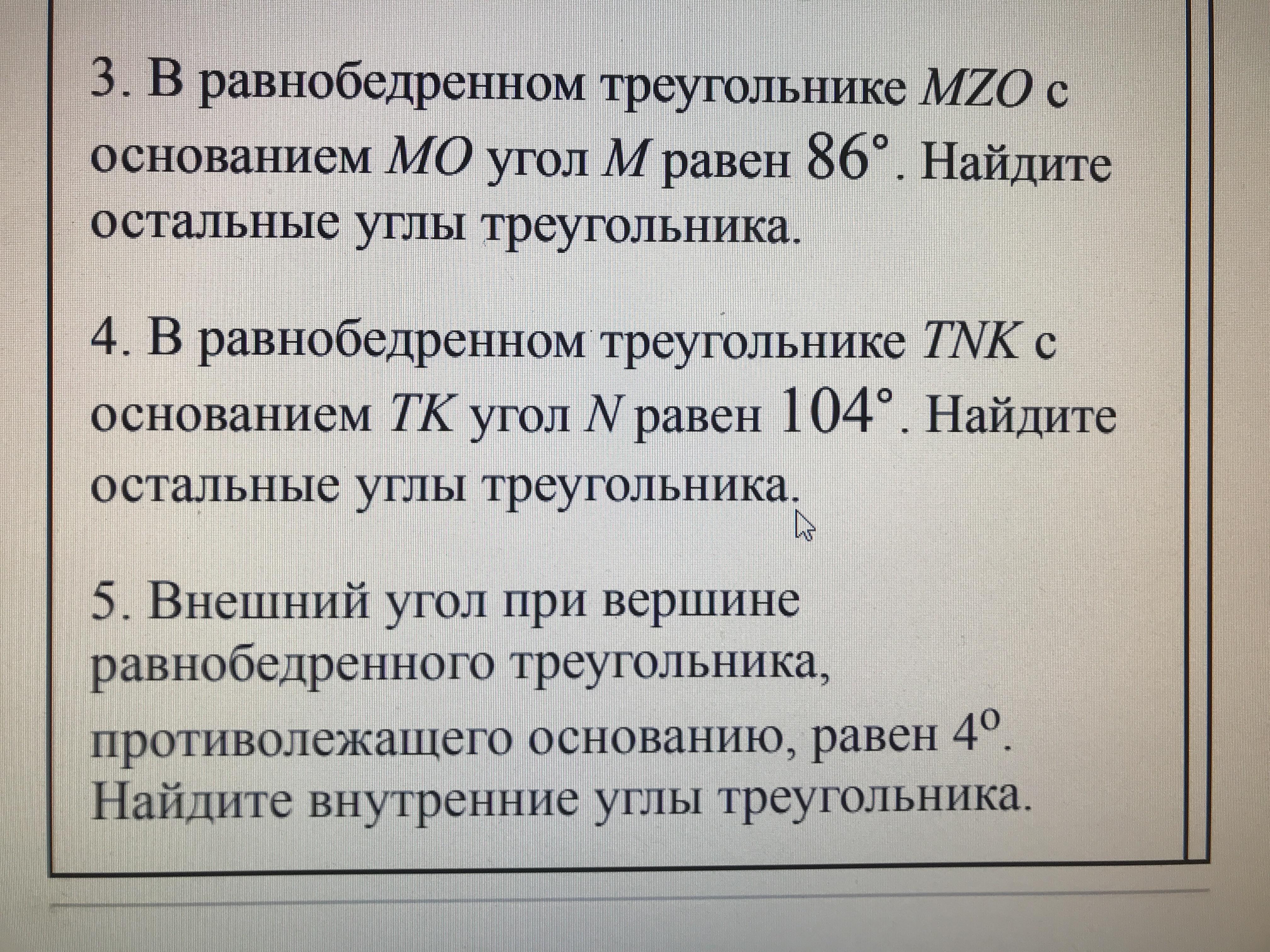 3. Углы М и О равны по 86°, т.к. углы при основании равны у равнобедренного треугольника, сумма углов треугольника составляет 180°значит, угол при вершине ∠Z= 180°-2*86°=8°.