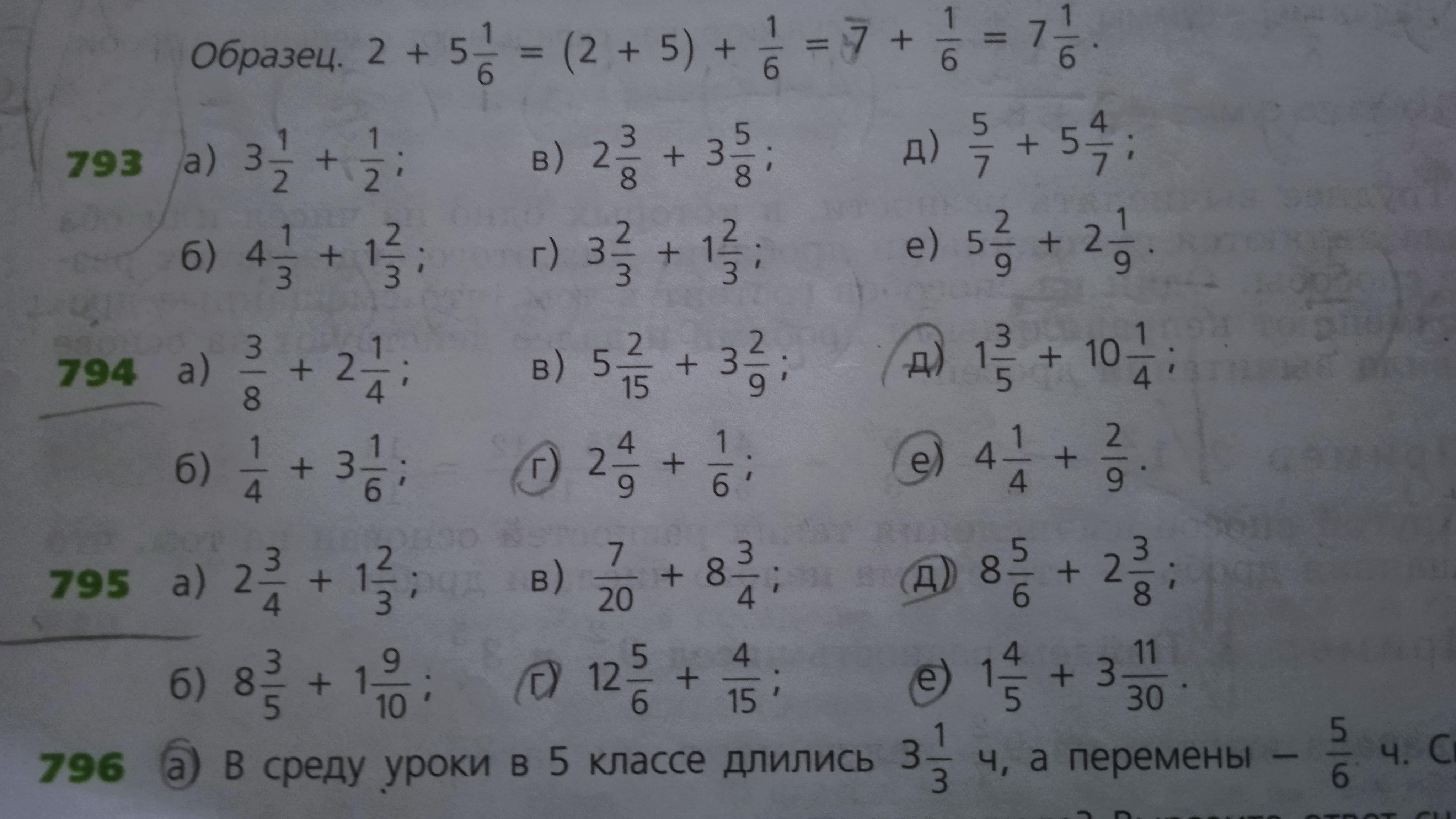 д. 4 3/5+ 10 1/4 = 4 12/20 + 10 5/20= 14 17/20