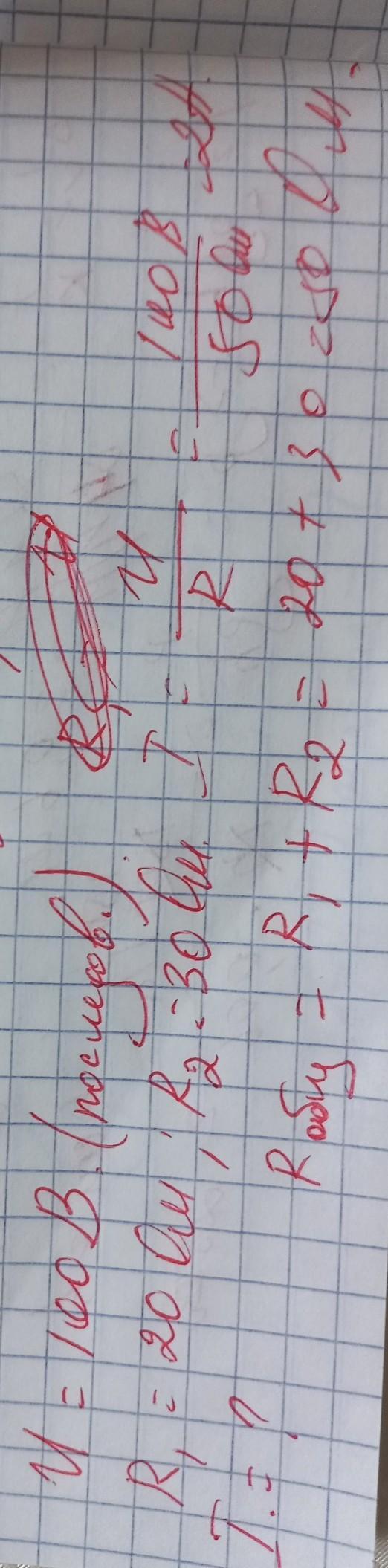 К источнику напряжением 100 вольт подключены две последовательно соединенные лампочки сопротивлением 20 и 30 Ом. Найти значение силы тока в цепи.
