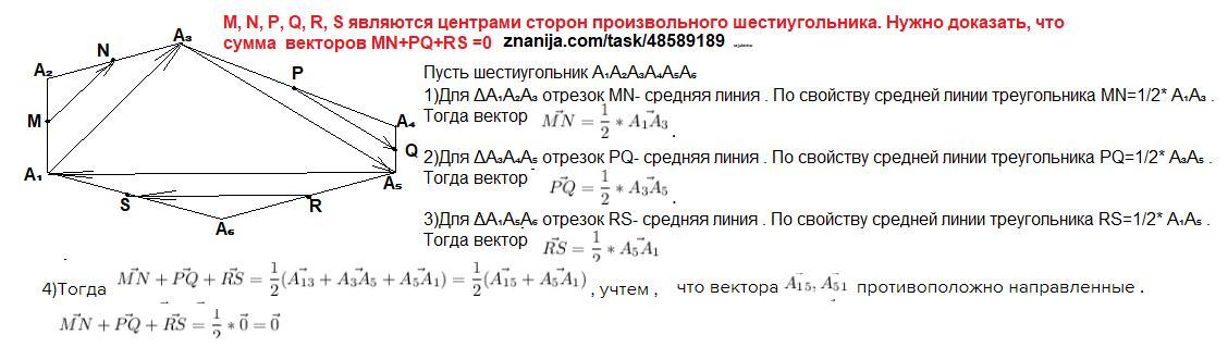 СРОЧНО!!! M, N, P, Q, R, S являются центрами сторон произвольного шестиугольника. Нужно доказать, что векторы MN+PQ+RS =0 (тоже вектор)