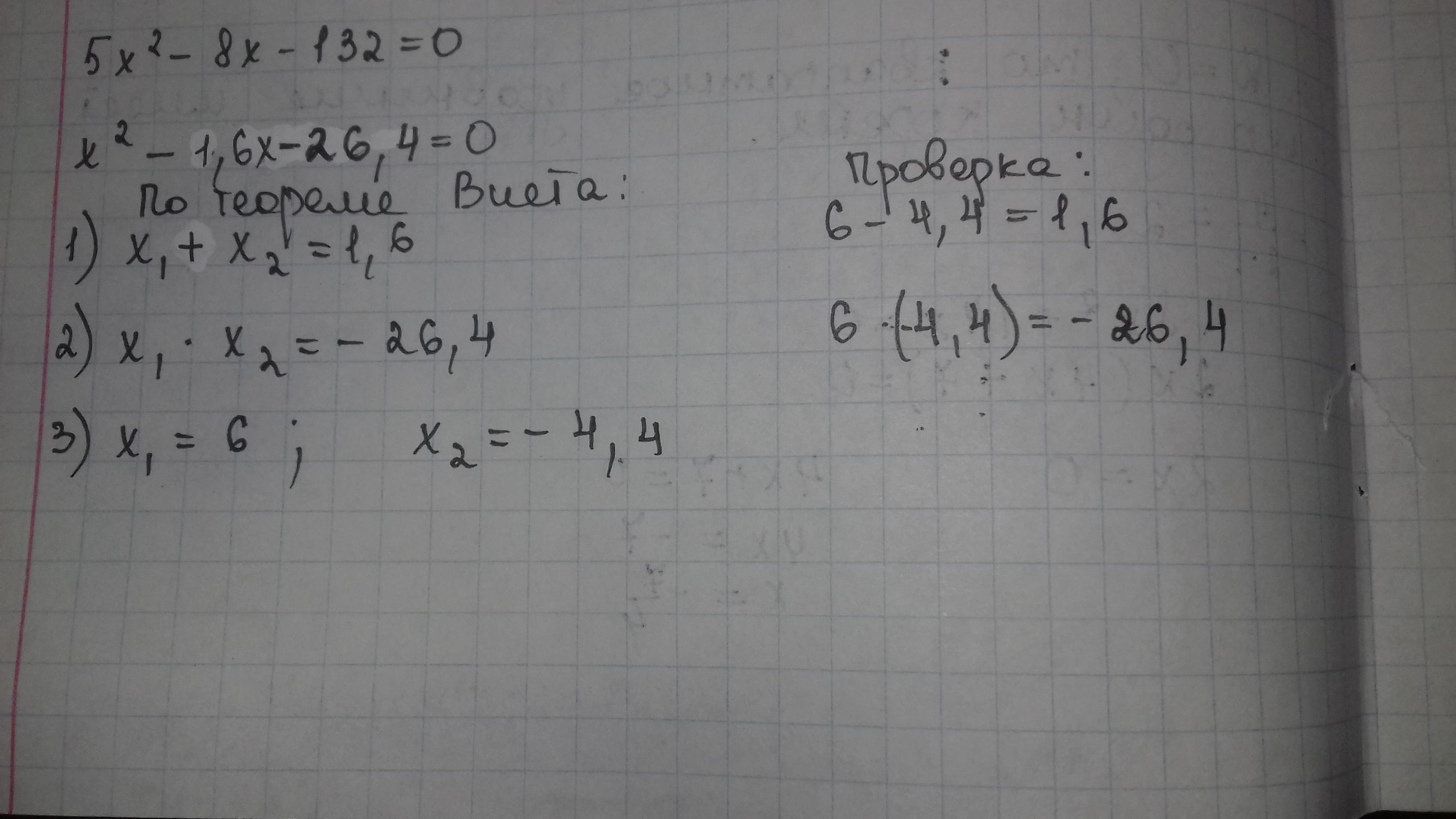 Реши уравнение 5x^2-8x-132=0 и выполни проверку, используя теорему, обратную теореме Виета.