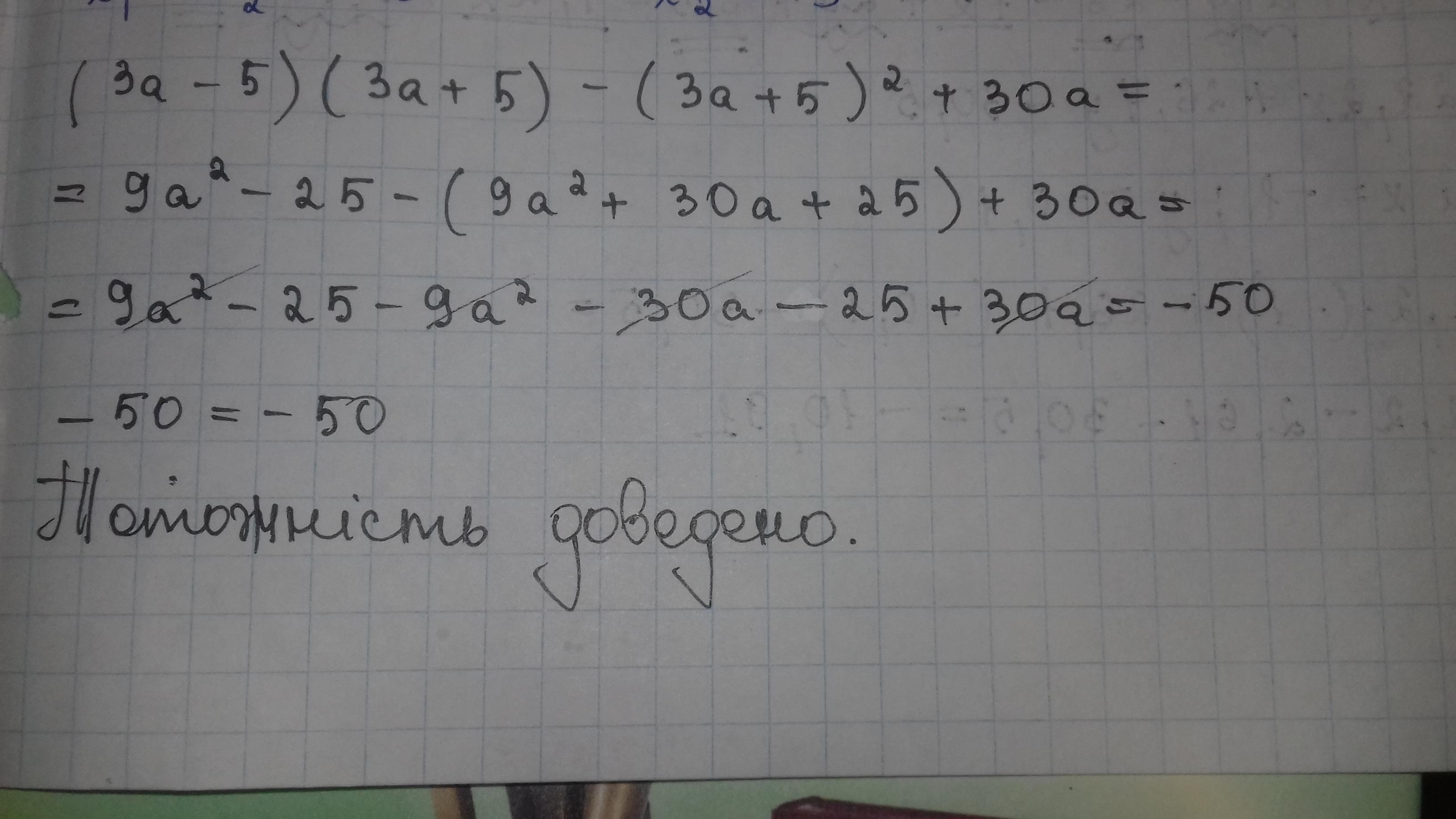 доведіть тотожність ( 3 a - 5 ) ( 3 a + 5 ) - ( 3 a + 5 ) ^2 + 30 a = - 50​