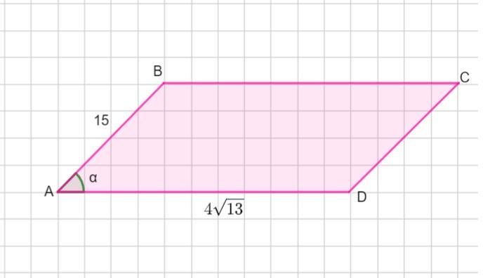 Одна из сторон параллелограмма 15, а другая 4√13 , тангенс одного из углов 2/3, найти площадь параллелограмма
