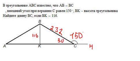 Из прямоугольного ΔВКС, где ∠ВКС=90° (т.к. ВК - высота в равнобедренном ΔАВС):