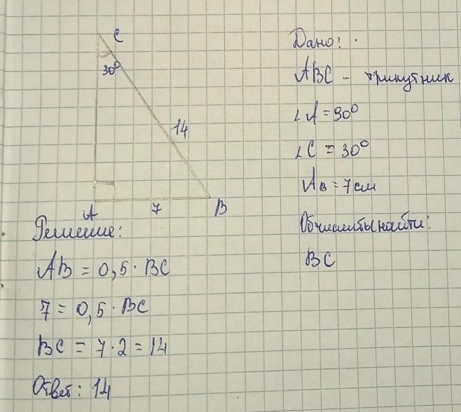 Дано трикутник АВС, <А=90°,<С=30°,Ав=7см.Обчисли ВС