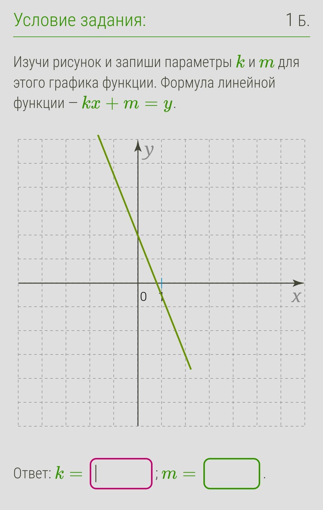 Если убрать к и m, то получим x=y, в этом случае функцию будет биссектрисой оси координат и пролегать через точки (1;1) и (-1;-1), у нас же х=1, когда у=5, следовательно х уменьшился в 5 раз. K=5, m=2 функция поднята на 2 вверх