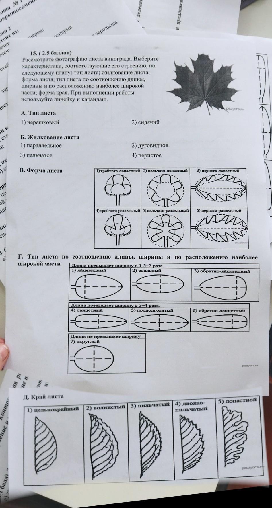 Форма листа винограда, предложенного для описания, воспользовавшись линейкой и карандашом, определяем как тройчато-разделенный.