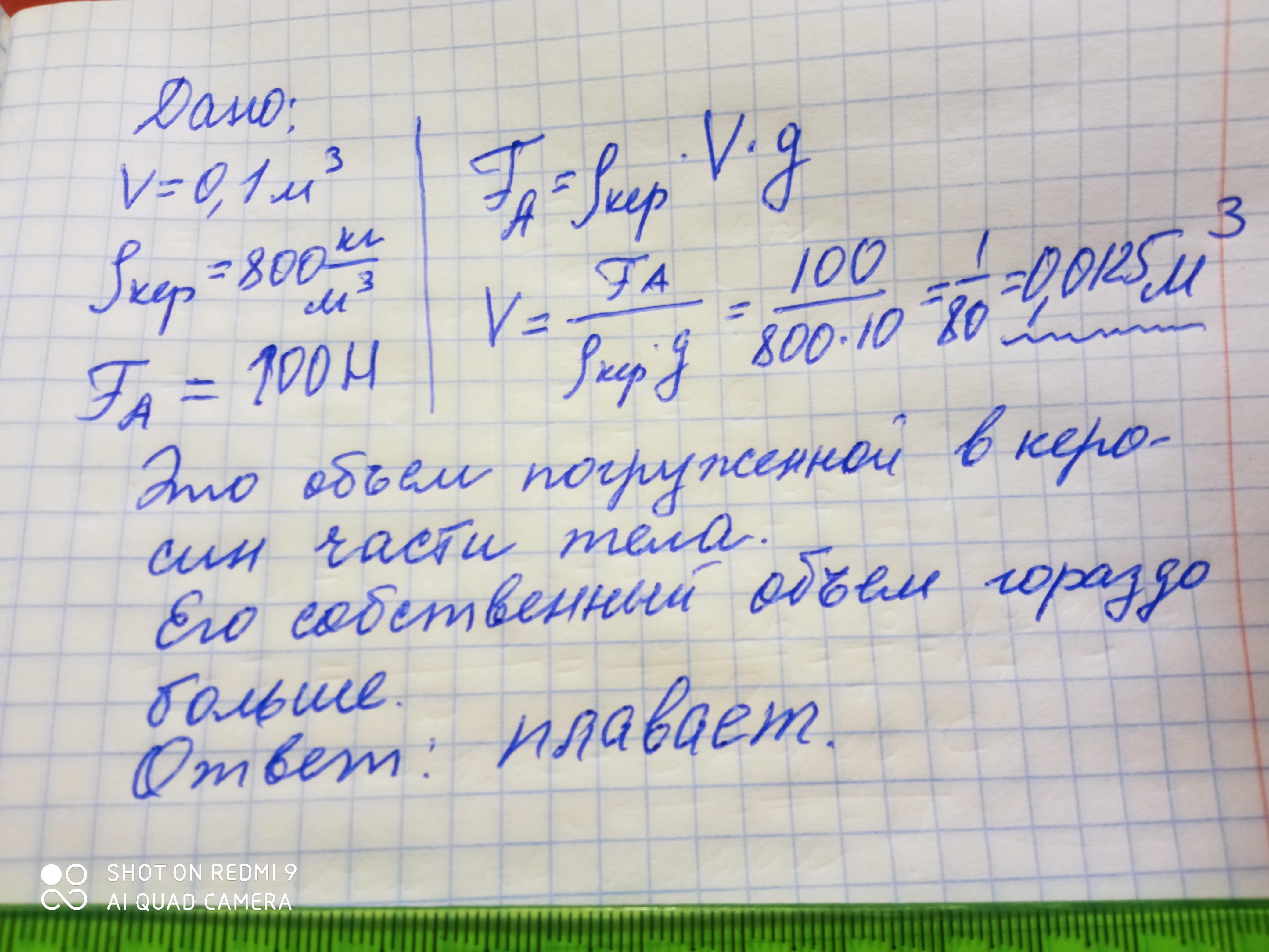 Срочно ... 70 баллов. определить плавает ли тело с объемом 0,1 м³ погружённый в керосин если на него действует сила архимедова 100 Н