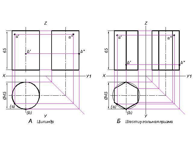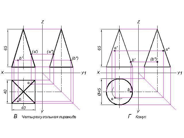 2. Найти проекции точек лежащих на поверхности заданных тел.