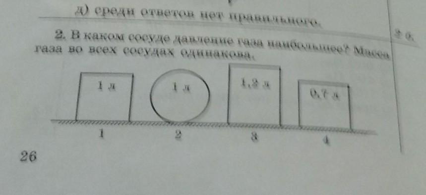 давление газа больше всех в 4 сосуде , т.к. его объем меньше , значит плотность больше , поэтому между молекулами маленькое расстояние и они начинают активно биться об стенки сосуда.