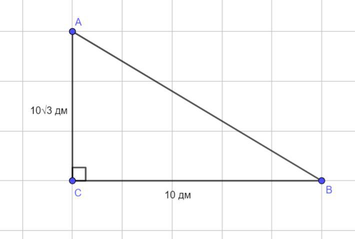 та гострі кути із точністю до мінут: AC = 10√3 дм, BC = 10 дм. (тобто, розв’яжіть