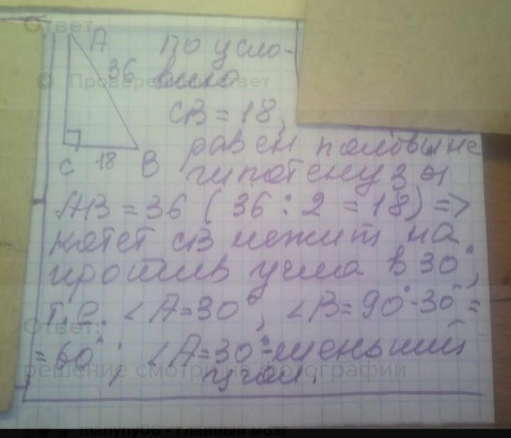 Гипетонуза прямоугольного треугольника 36 см, один из катетов 18 см . Найдите наименьший из углов.