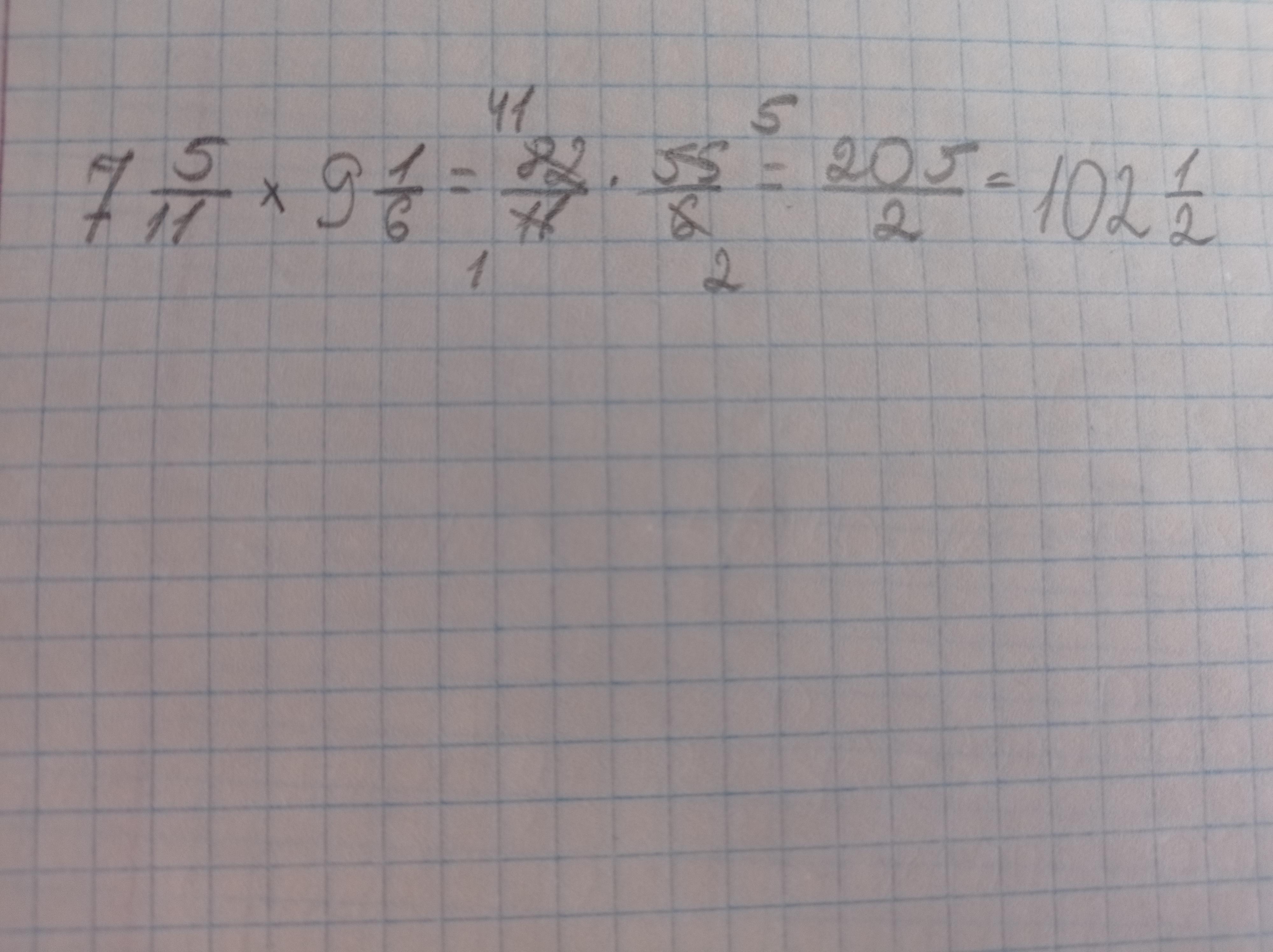 -7 целых 5/11× 9 целых 1/6 = -82/11 * 55/6 = -205/3 = -68 1/3