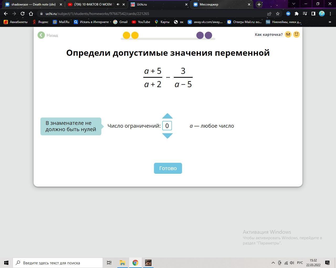 Снизу (не знаю как по русски) не должно быть нулей. Если а=-2, то снизу получится ноль, также при a=5. Сверху может быть что угодно