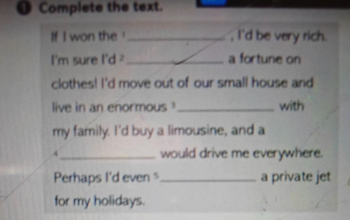 Complete the text. I won the I'd be very rich I'm sure I'd a fortune on clothes! I'd move out of our small house and live in an enormous with my family, I'd buy a limousine, and a would drive me everywhere. Perhaps I'd even a private jet for my holidays