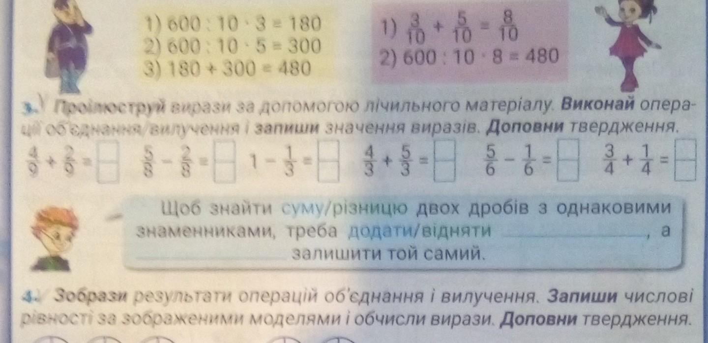Чтобы найти сумму двух дробей с одинаковыми знаменателями, нужно числитель первой дроби сложить с числителем второй дроби, а знаменатель оставить без изменений.