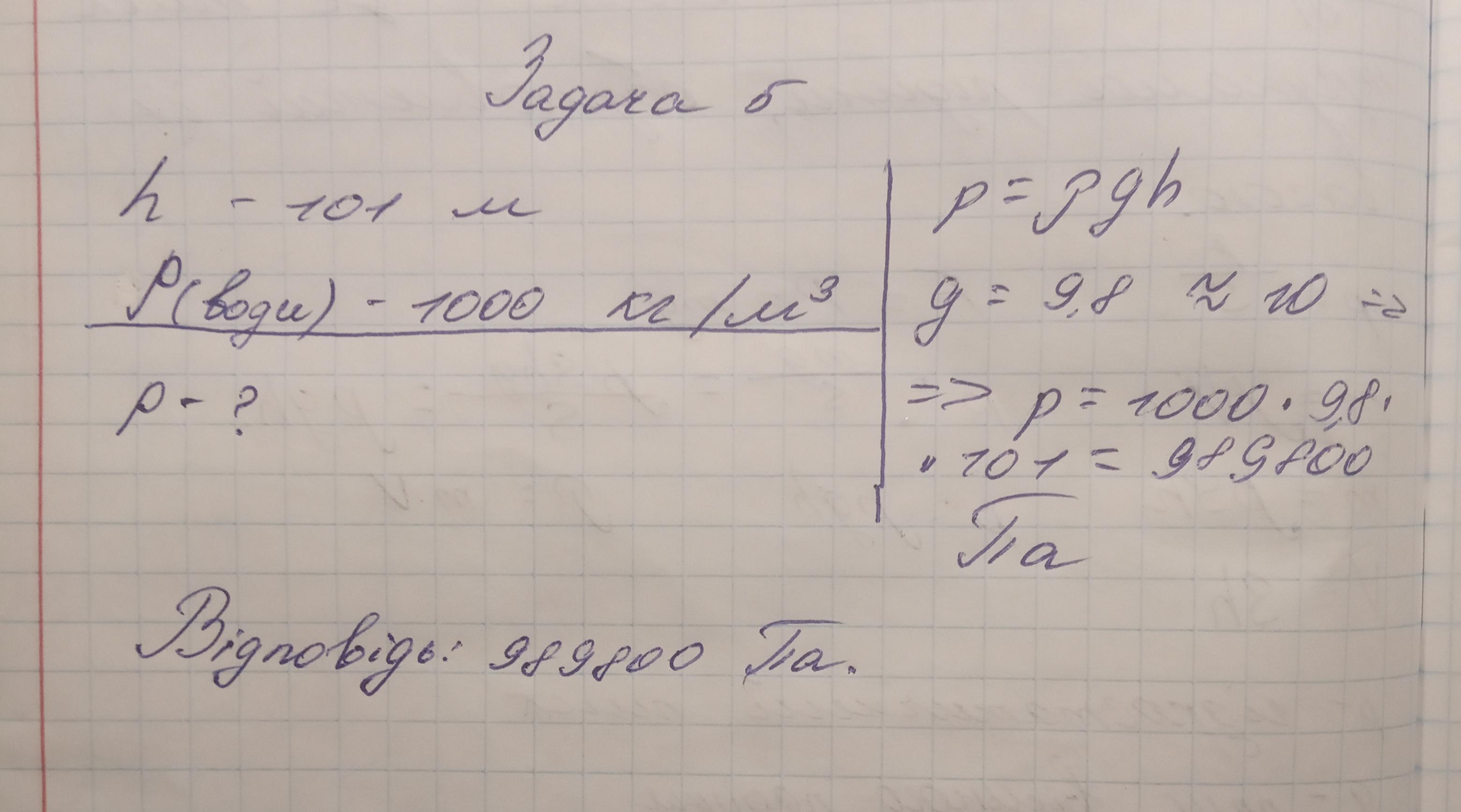 Задача № 5. Посередині України, в самому Житомирі, є гранітний кар'єр, як Виявилось, — найглибша водойма України. Ехолот показав 101 метр глибини. Під яким тиском перебували пірнальники, підкорюючи найглибший прісноводний кар'ер?