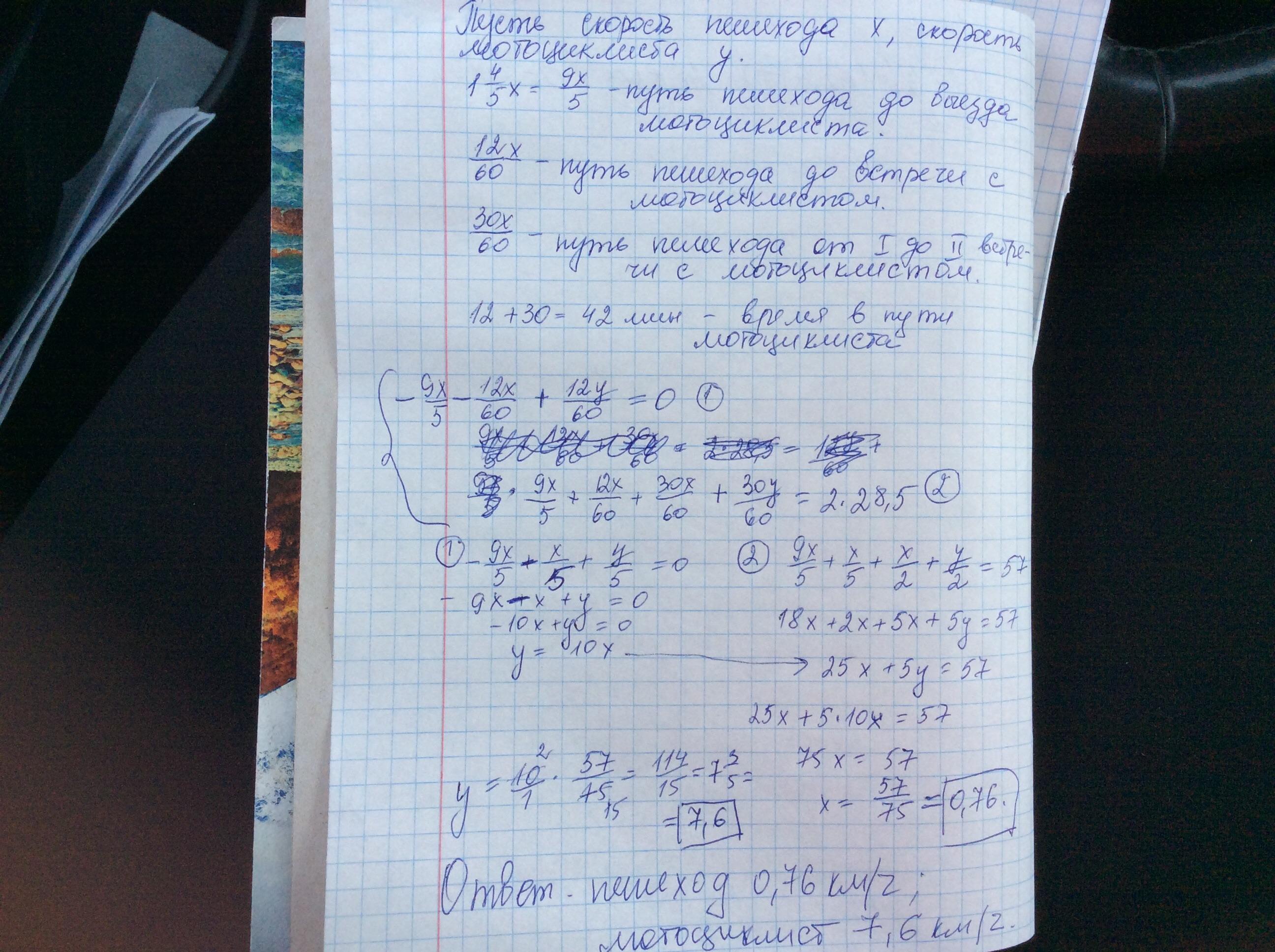 Ответ: Пешеход 0,76 км/ч; мотоциклист 7,6 км/ч