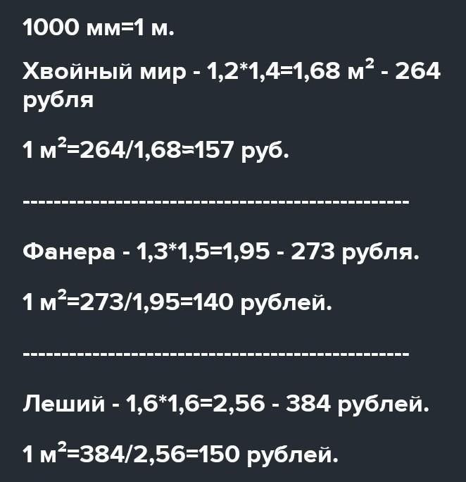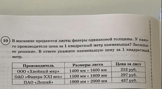 В магазине продаются листы фанеры одинаковой толщины. У какого производителя цена за 1 квадратный метр наименьшая? Запишите решение. В ответе укажите наименьшую цену за 1 квадратный метр.