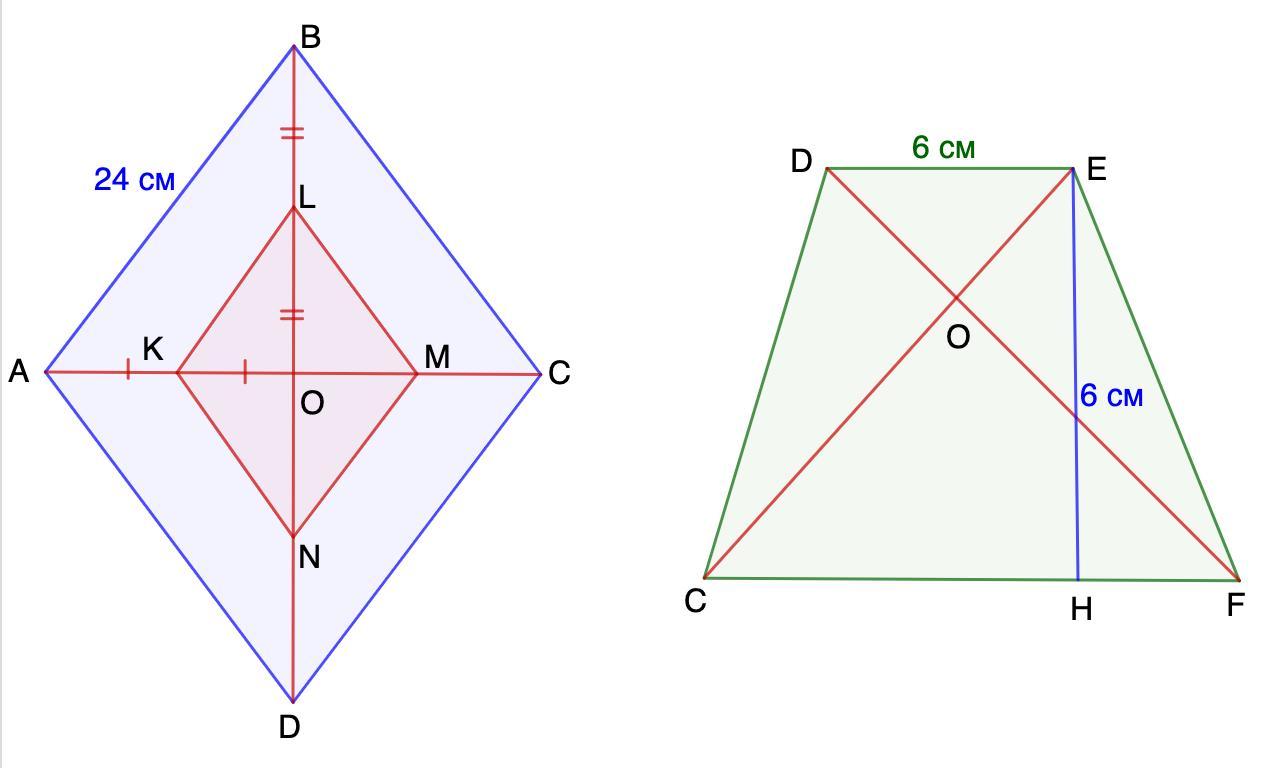 Задача 1. Диагонали ромба АВСD пересекаются в точке О. Точки К, L, М, N середине сторон АО, ВО, СО, DО соответственно. Сторона АВ = 24 см. Найти периметр КLМN.