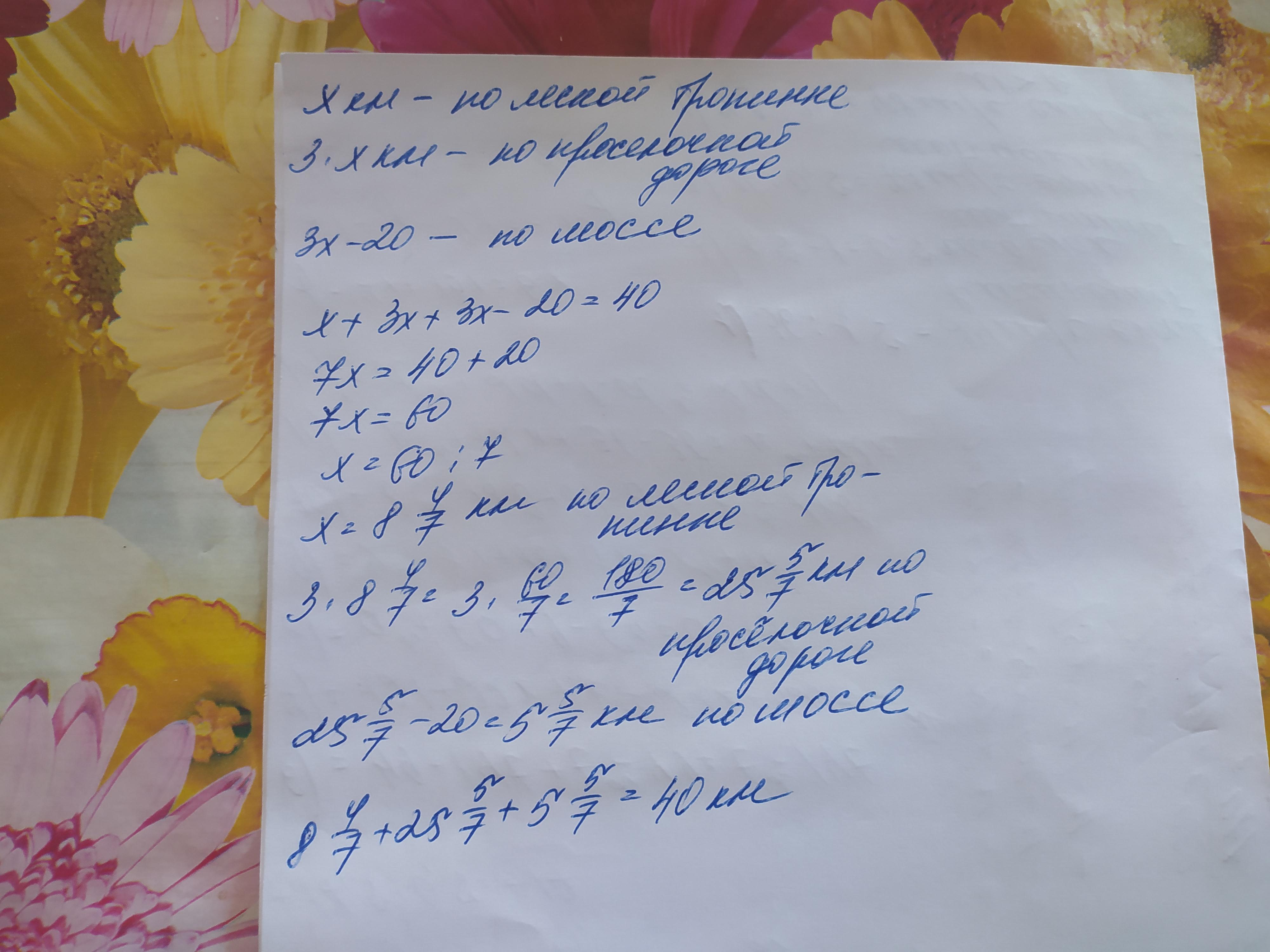 1. Велосипедист проехал за три дня 40 км. По проселочной дороге он проехал в 3 раза большее расстояние, чем по лесной тропинке, а по шоссе — на 20 км больше, чем по проселочной дороге и по лесной тропинке. Какой длины была каждая часть пути велосипедиста? ПОЖАЛУЙСТА срочноо