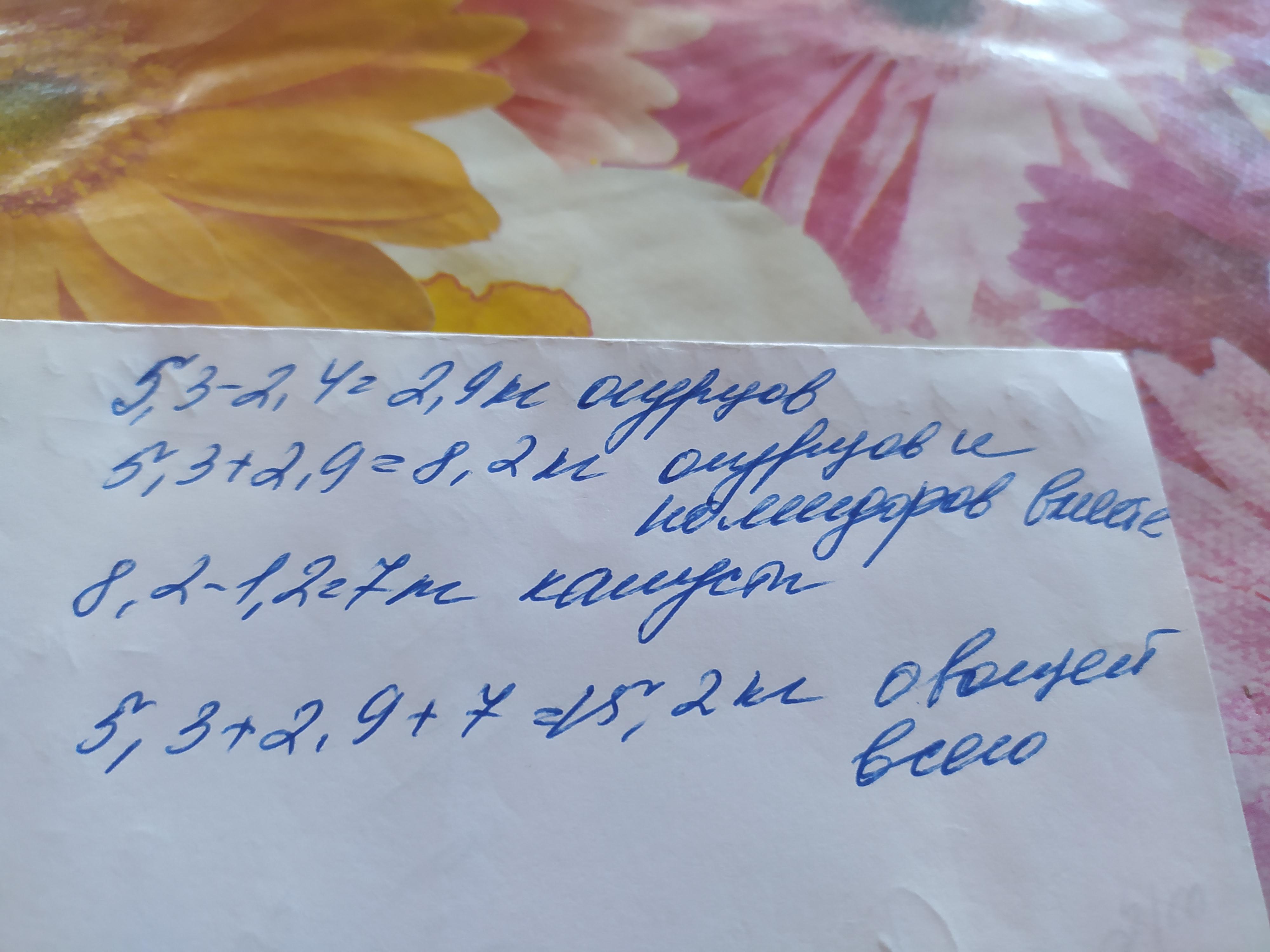 Помогите!Очень нужно!Помідорів купили 5,3 кг, що на 2,4 кг більше, ніж купили огірків. Капусти купили на 1,2 кг менше, ніж помідорів і огірків разом. Скільки всього купили кілограмів овочів?