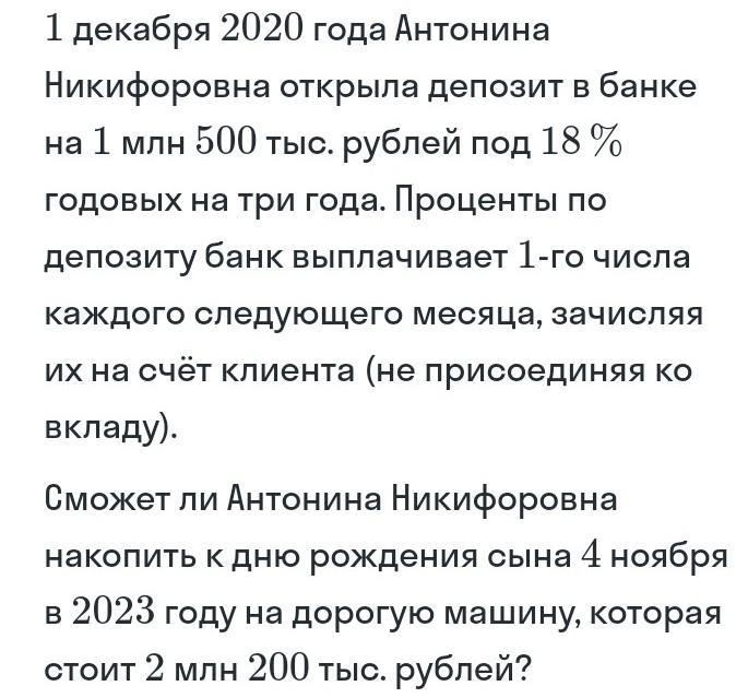 Как мы видим неравенство выполняется , значит она смогла накопить 2,2 млн рублей