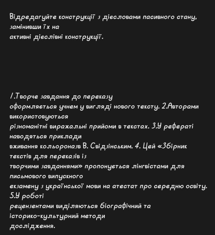 1. Творче завдання до переказу оформлює учень у вигляді нового тексту.