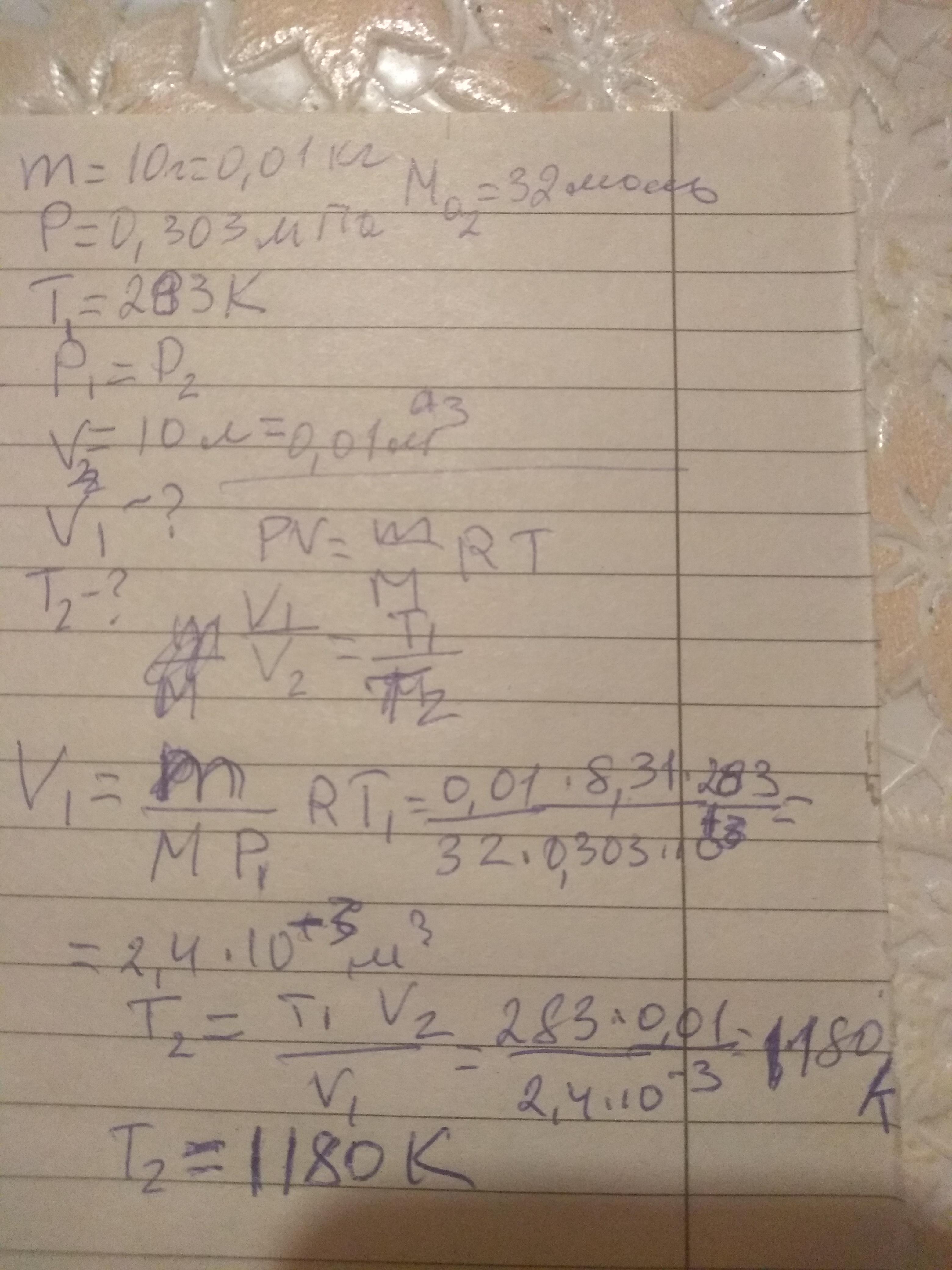 кисень масою 10 г міститься в балоні під тиском 0,303 мпа і за температури 10 градусів. після нагрівання за постійного тиску він зайняв об’єм 10 л. знайдіть початковий об’єм і кінцеву температуру газу