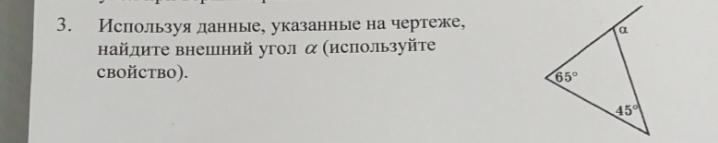 По свойству внешнего угла, он равен сумме двух углов треугольника, не смежных с ним ⇒ внешний угол а равен 65 + 45 = 110°
