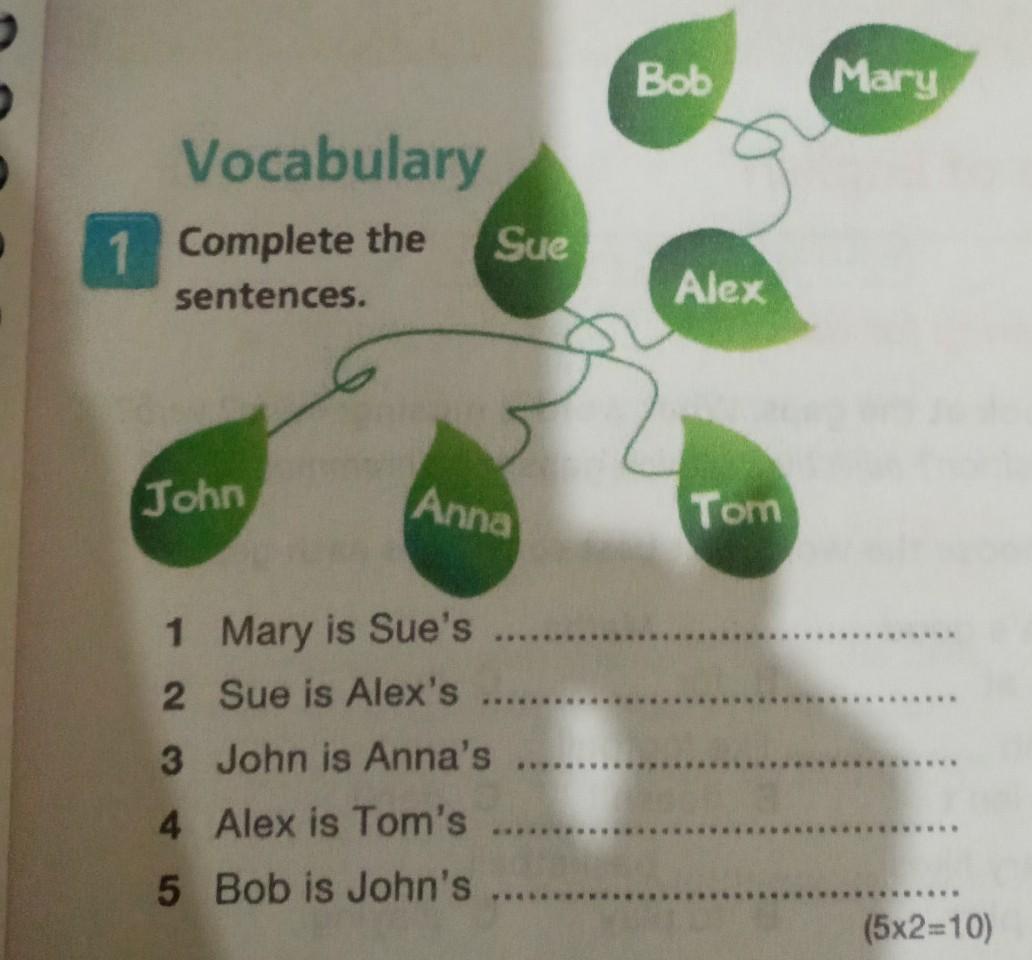 На сколько поняла, Мэри и Боб - это родители, Сью Алекс- их сын и невестка, а Джон, Анна, Том - их внуки. Поэтому: