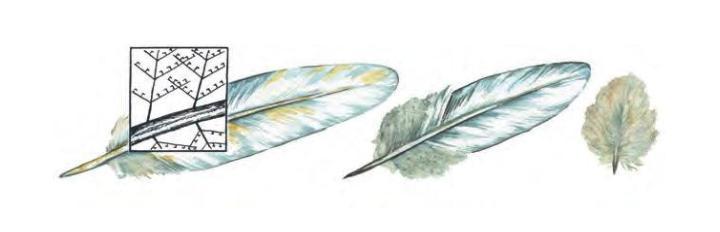 Рассмотрите контурное маховое, контурное кроющее и пуховое перо. Чем они отличаются? Подпишите названия перьев на рисунке.