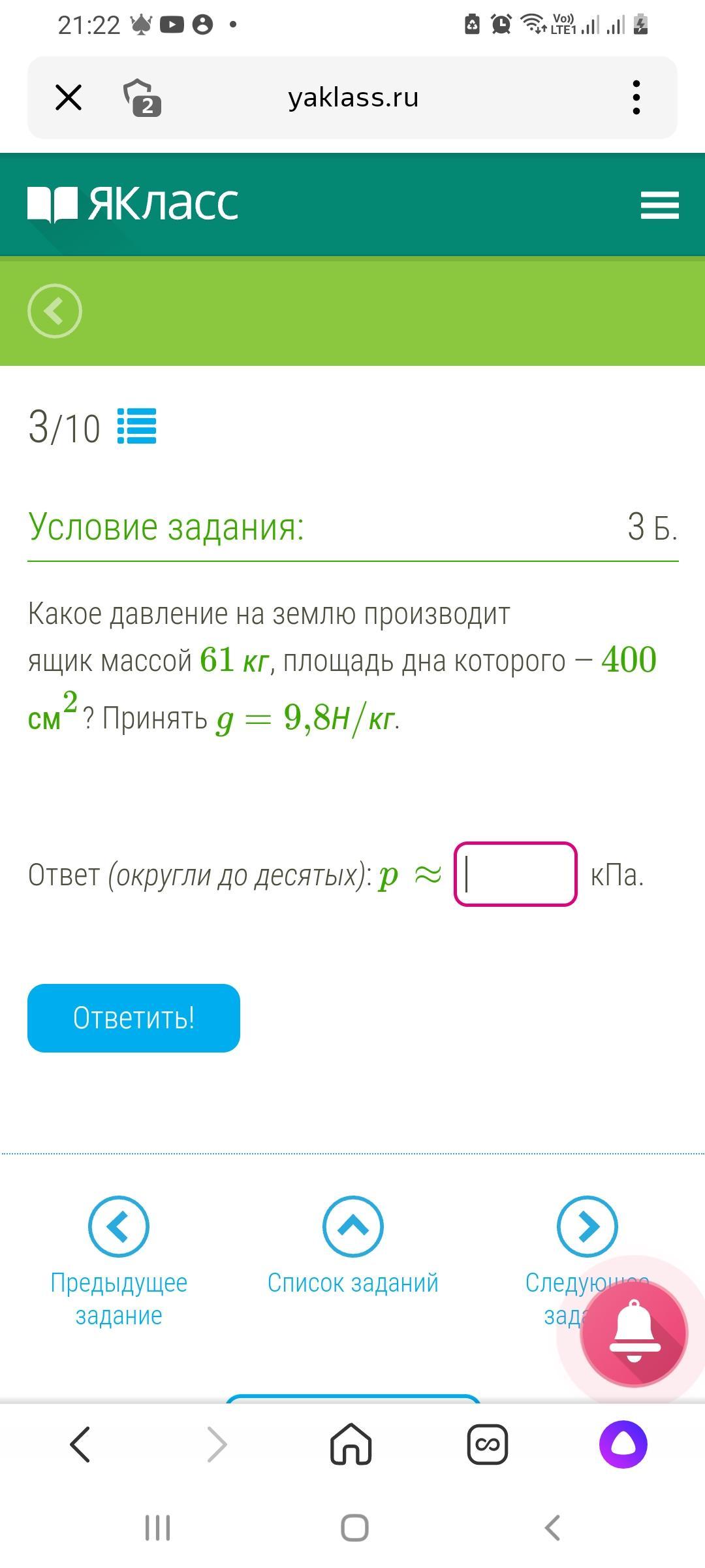 p=F/S=m*g/S=61*9.8/0.04=14945 Па