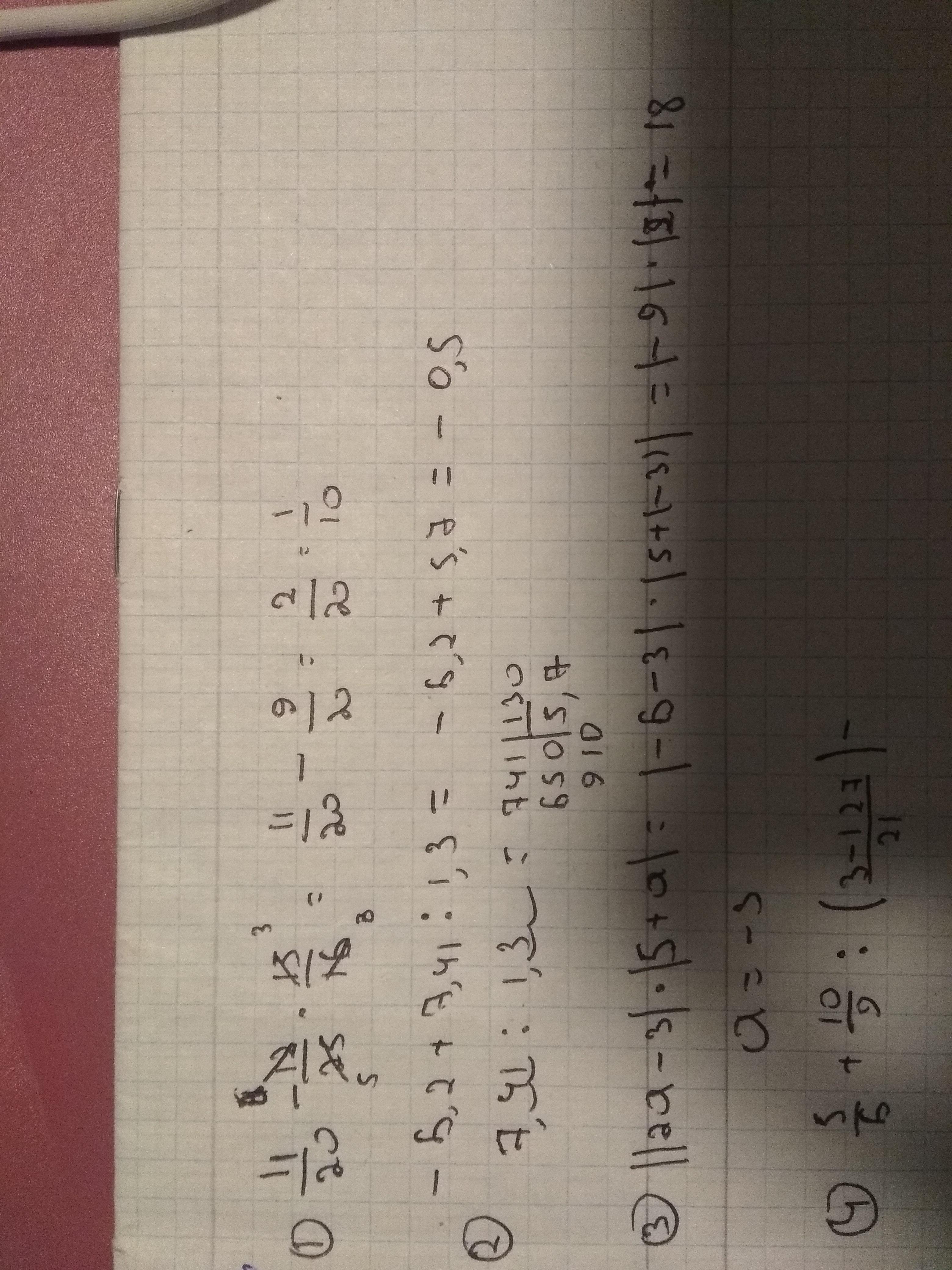 Вычислить 11/20-12/25*15/16; вычислить -6,2+7,41÷1,3; вычислить ||2а-3|*|5+а| при а=-3; вычислить 5/6+10/9÷(3-1 27/21)-1 11/30