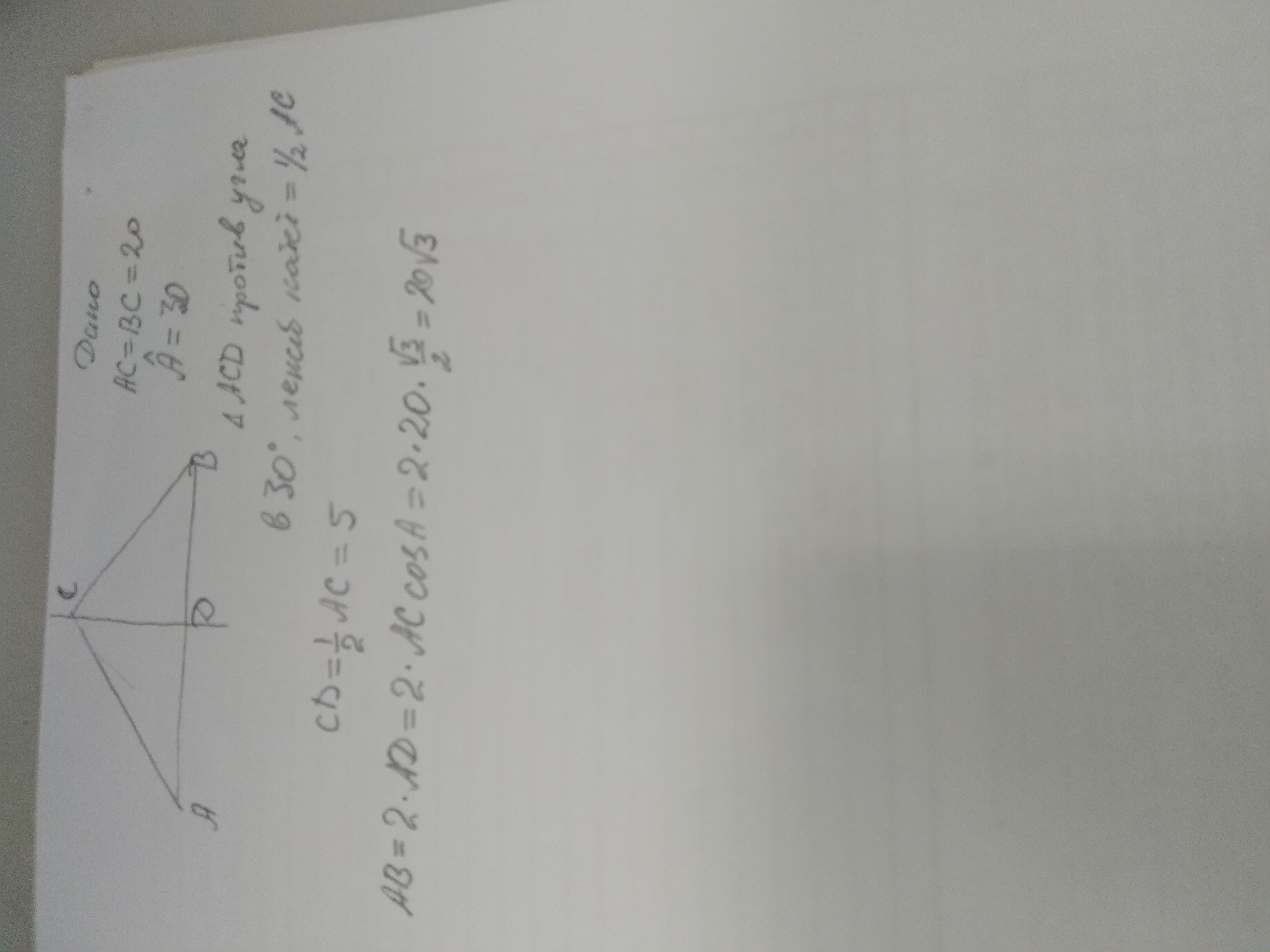 у рівнобедроному трикутнику кут при основі дорівнює 30 градусів бічна сторона 20см.знайдвть основу трикутника й висоту опущену на основу