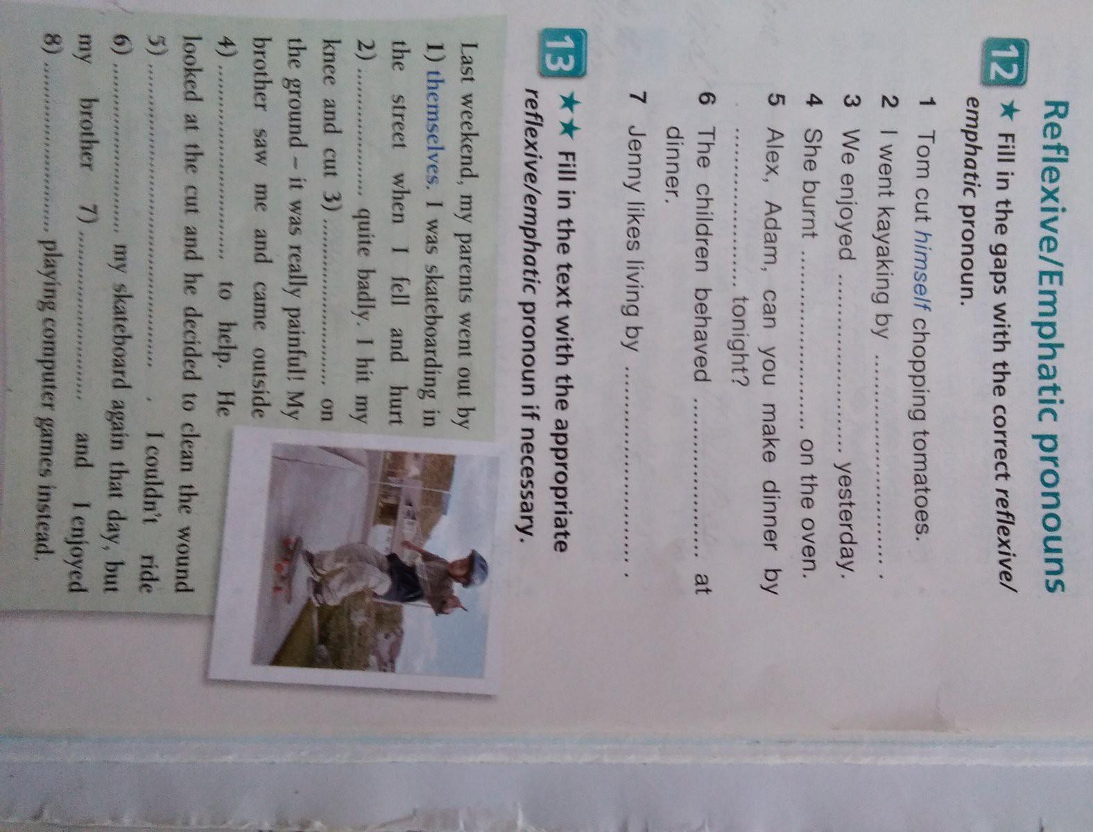 13. Last weekend, my parents went out by themselves. I was skateboarding in the street when I fell and hurt myself² quite badly. I hit my knee and cut myself³ on the ground — it was really painful! My brother saw me and came outside himself⁴ to help me. He looked at the cut and decided to clean the wound himself⁵. I couldn't ride myself⁶ my skateboard again that day, but my brother himself⁷ and I enjoyed ourselves⁸ playing computer games instead.