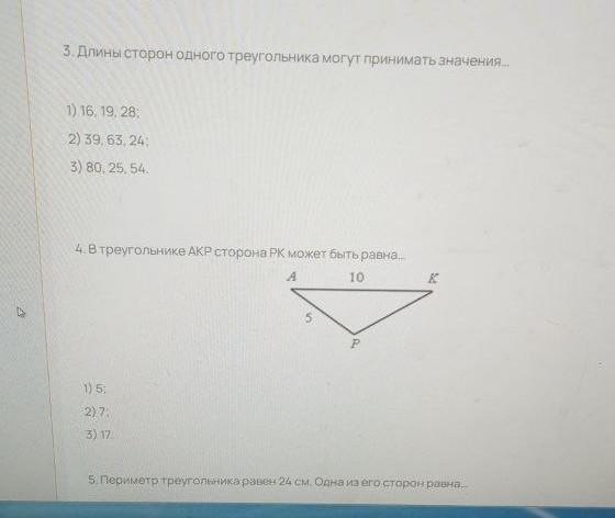 В 3-сумма двух сторон треугольника не должна быть больше третьей стороны