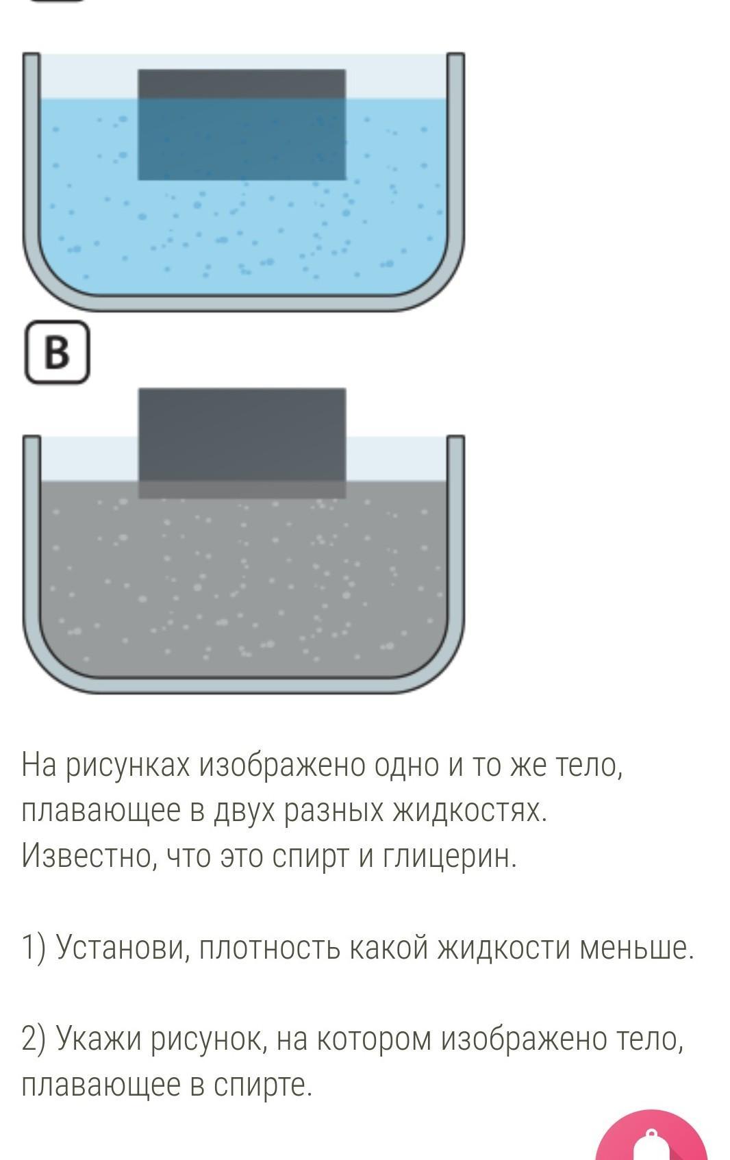 Плотность спирта меньше глицерина и тело погрузится в него глубже.