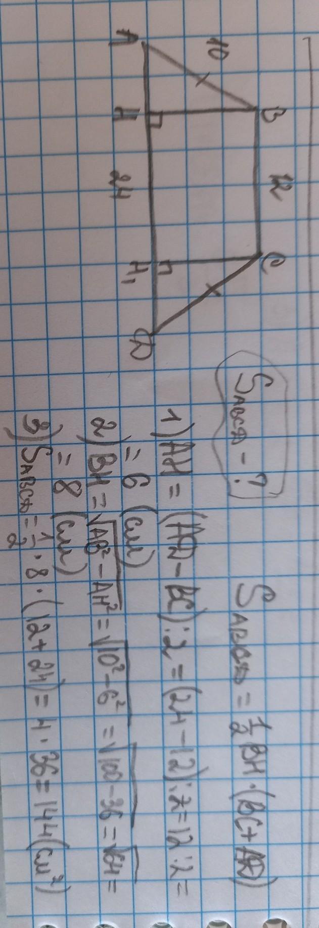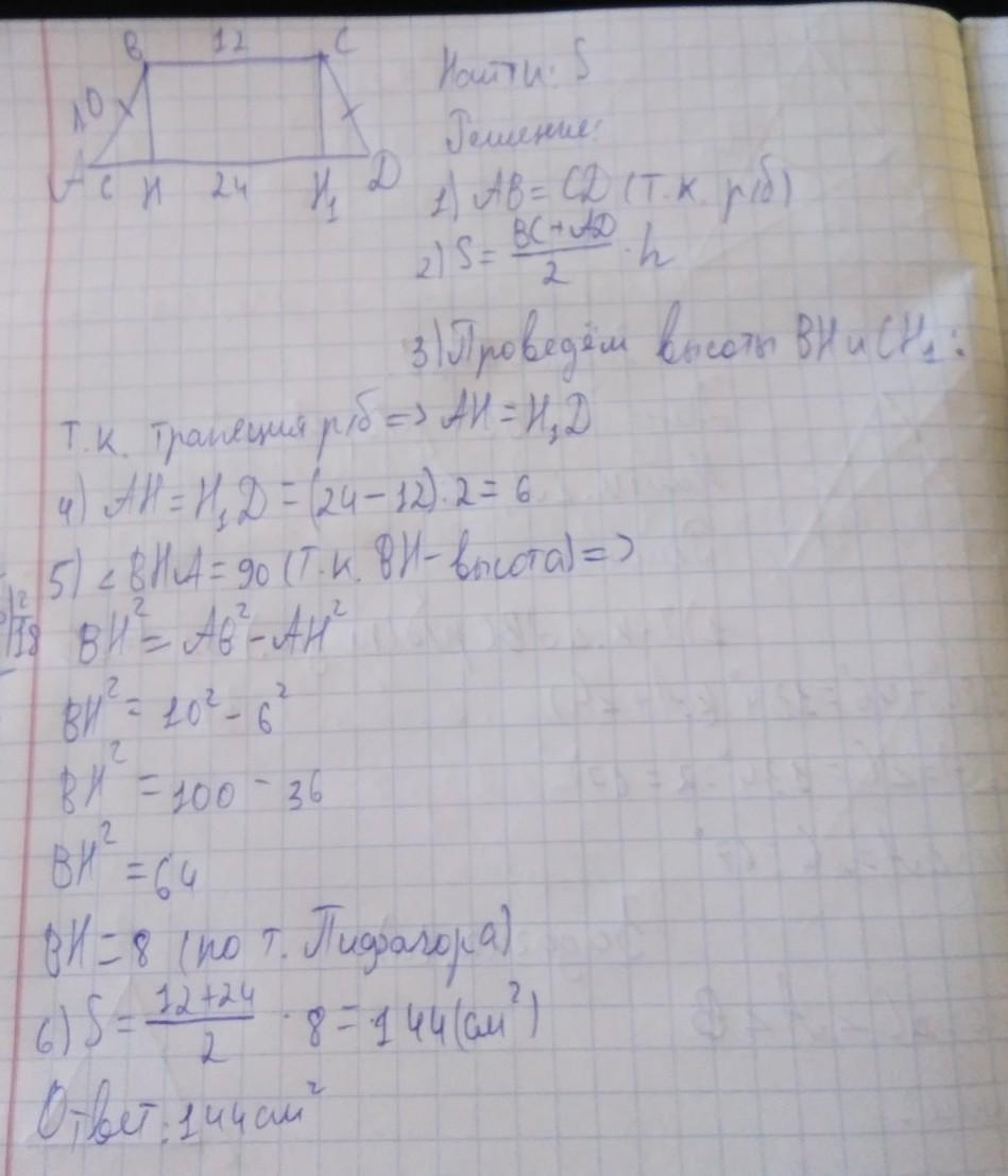 10. В равнобедренной трапеции боковая сторона равна 10 см, основания 12 см и 24 см. Найдите Площадь трапеции.помогитеее пожалуйста