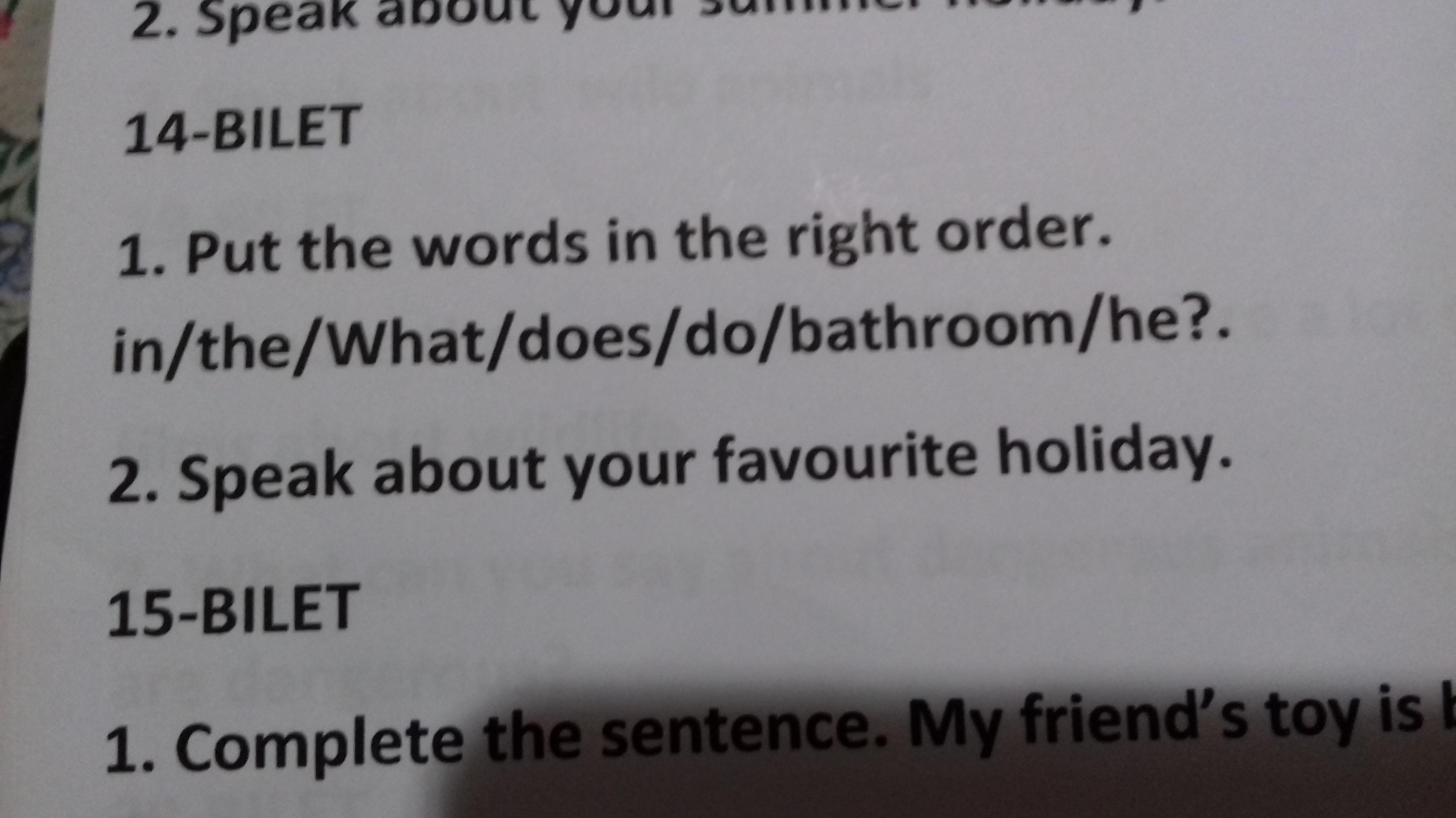14 билет. Помогите составить предложение! Слова : in/the/what/does/do/bathroom/he? .