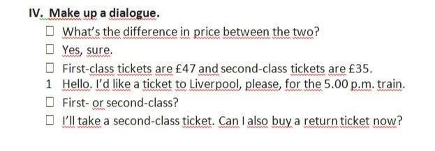 1. Hello. I'd like a ticket to Liverpool, please, for the 5.00 p.m. train.