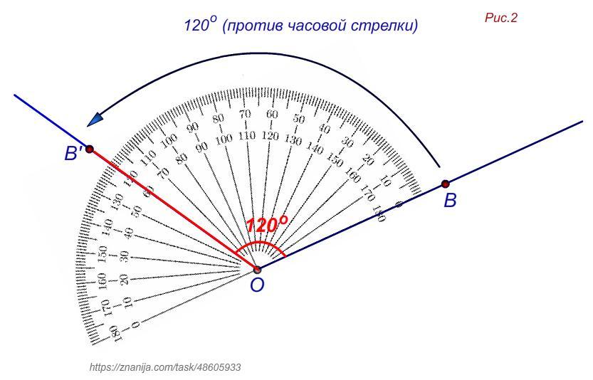 Так как дан положительный угол поворота, то отложим с помощью транспортира угол 120⁰ в направлении против движения часовой стрелки, проведем луч.
