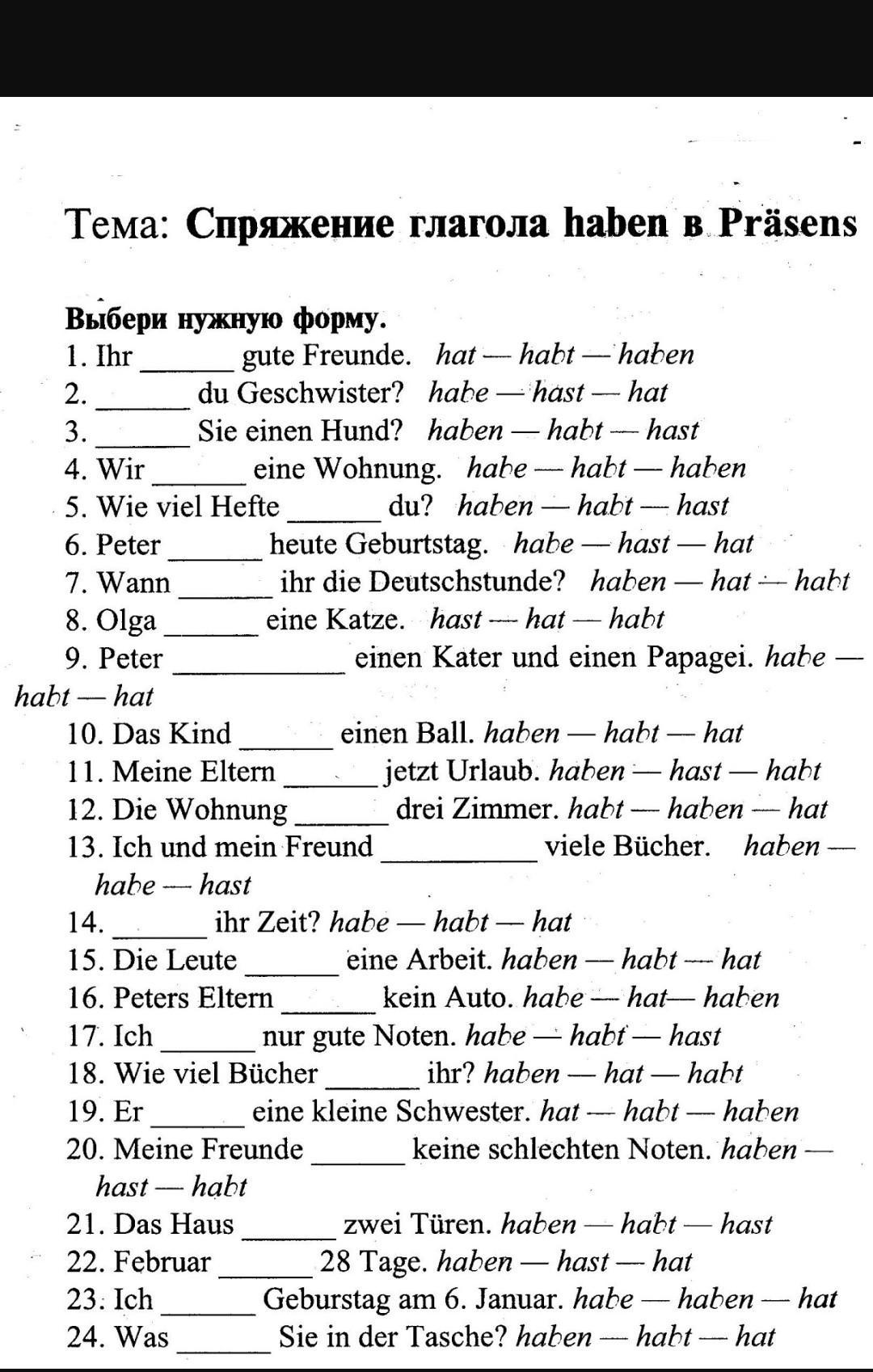 1 habt 2 hast 3 haben 4 haben 5 hast 6 hat 7 habt 8 hat 9 hat 10 hat 11 haben 12 hat 13 haben 14 habt 15 haben 16 haben 17 habe 18 habt 19 hat 20 haben 21 hat 22 hat 23 habe 24 haben