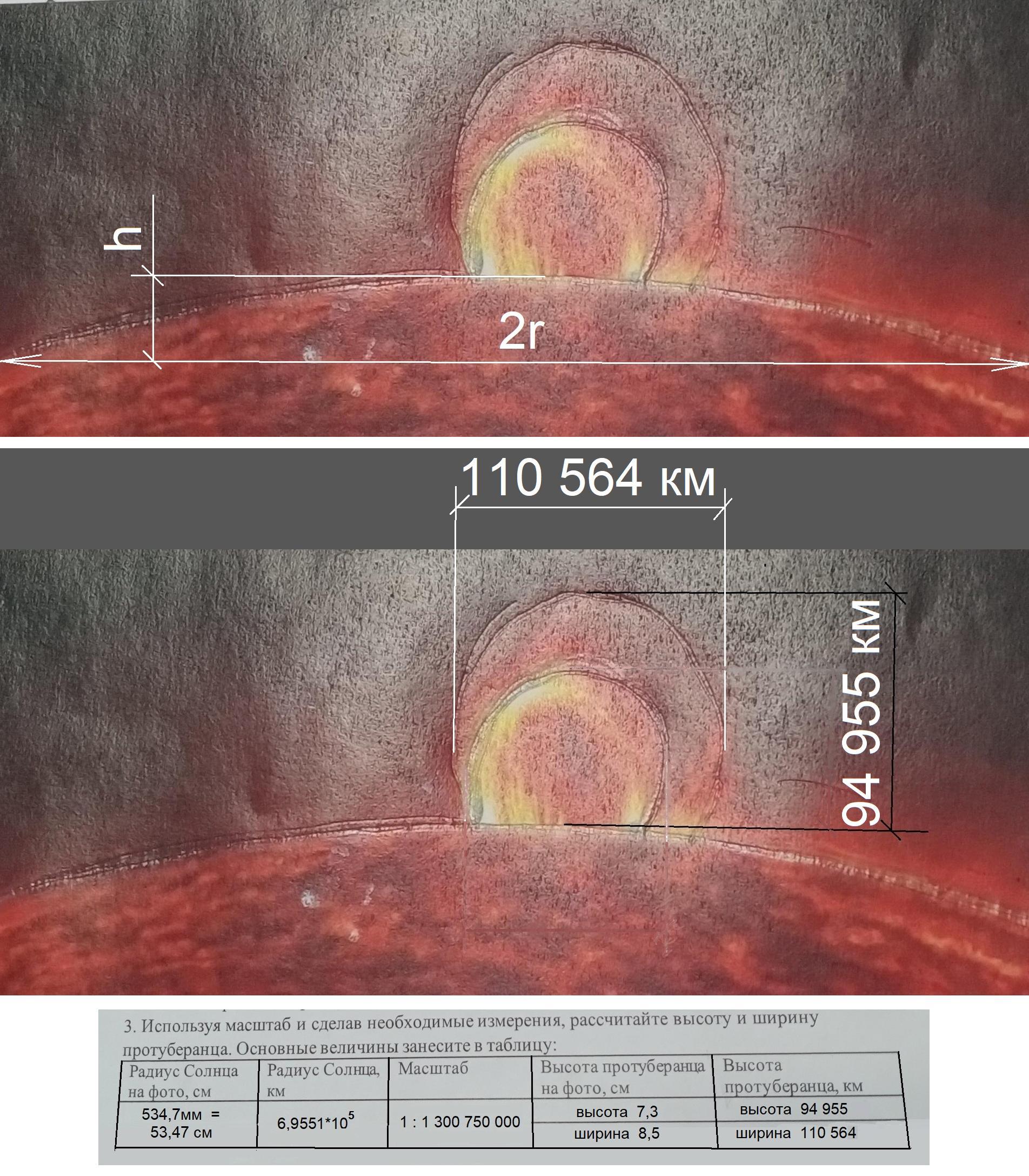 Измерение размеров r и h, и затем высоты и ширины протуберанца, производил на мониторе (см. рисунки)